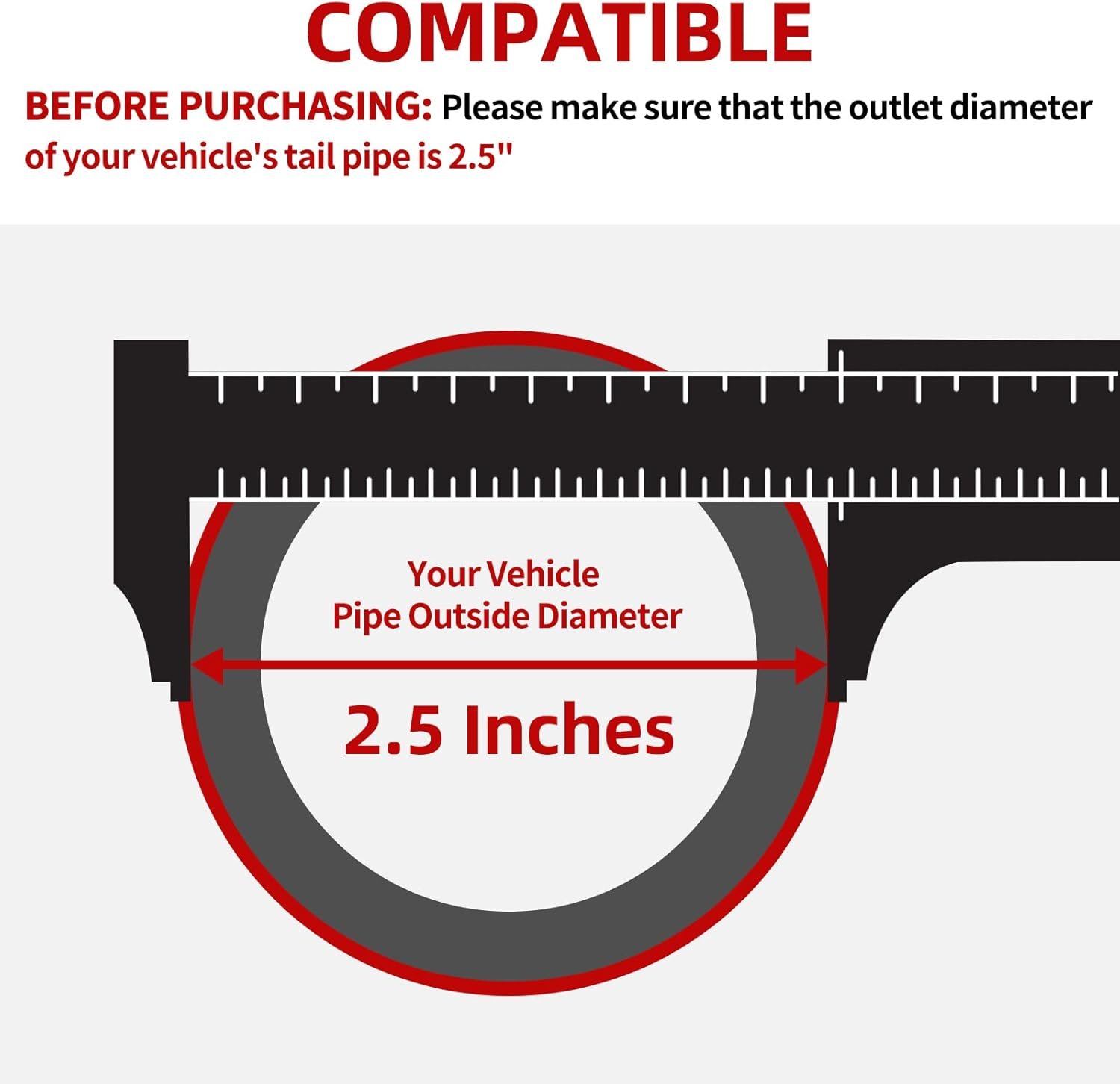 Notice: Please measure the outlet diameter of your pipe prior before purchase this exhaust tip and it should not be larger than the inlet diameter of the exhaust tip (2.5 inches)
