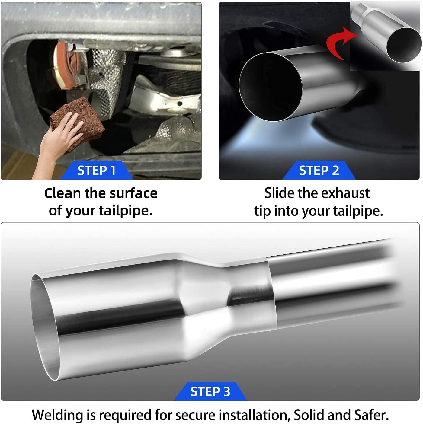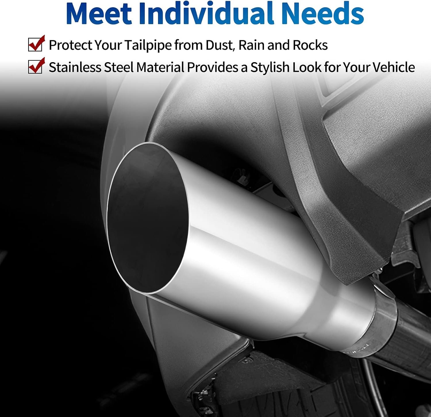 Stylish Look: Stainless steel material made with chrome-plated finishing provides a stylish look for your vehicle instead of the rusted old tailpipe. Effective protect your tailpipe from dust, rain and rocks, also Prevent it from deformation and damage.