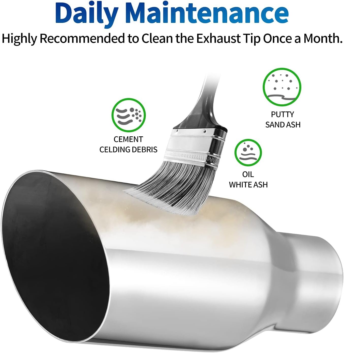 Daily Maintenance: To make this exhaust tip has a long-life service – Please Sweep away the welding debris, cement, oil, white ash, putty, sand ash regularly to keep the surface clean. We recommend to do above action once a month (NOTE: Professional installation would be highly recommended)