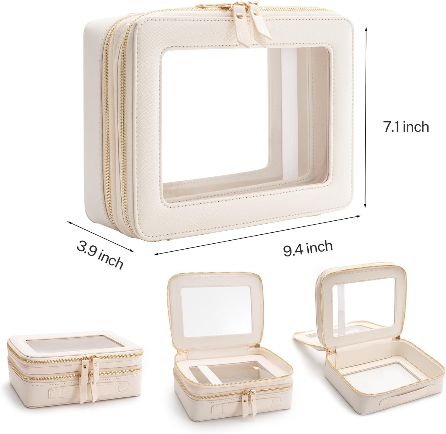 ❤【DOUBLE SIDED DESIGN】Measuring 9.4’’ x 7.1‘’ x 3.9”(24cm x18cm x 9.9cm), our makeup bag adopts a thoughtful double layer design. The upper layer is designed slightly smaller, serves as a neat makeup brush holder organizer. The larger lower layer offers ample space for storing cosmetics and toiletries. A versatile clear cosmetic bag for travel, a handy toiletry companion for the car center console, and a stylish organizer for your bathroom essentials.