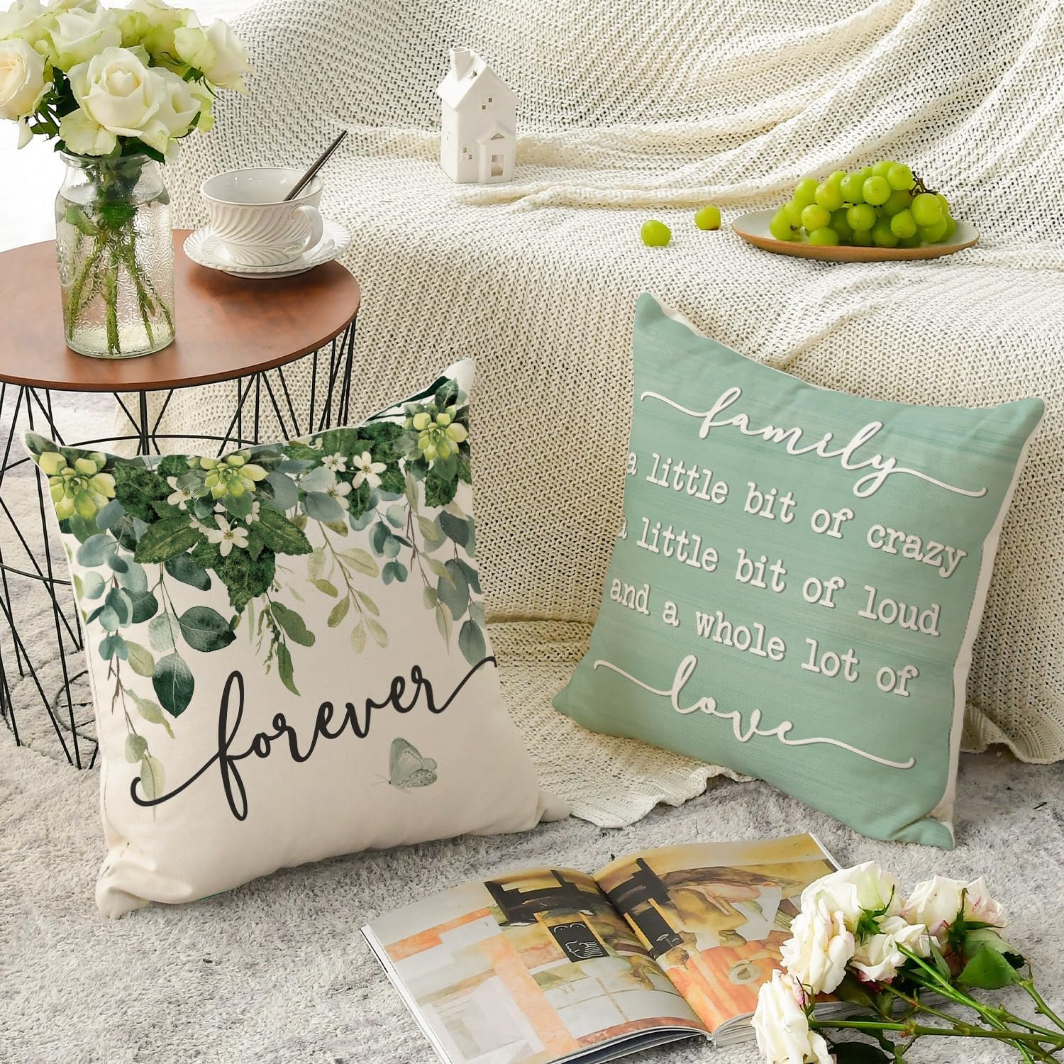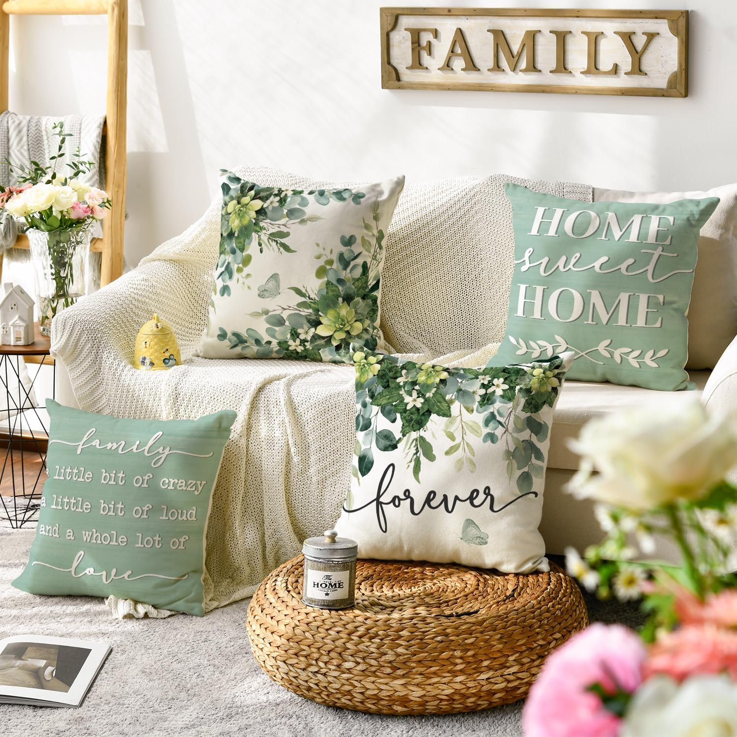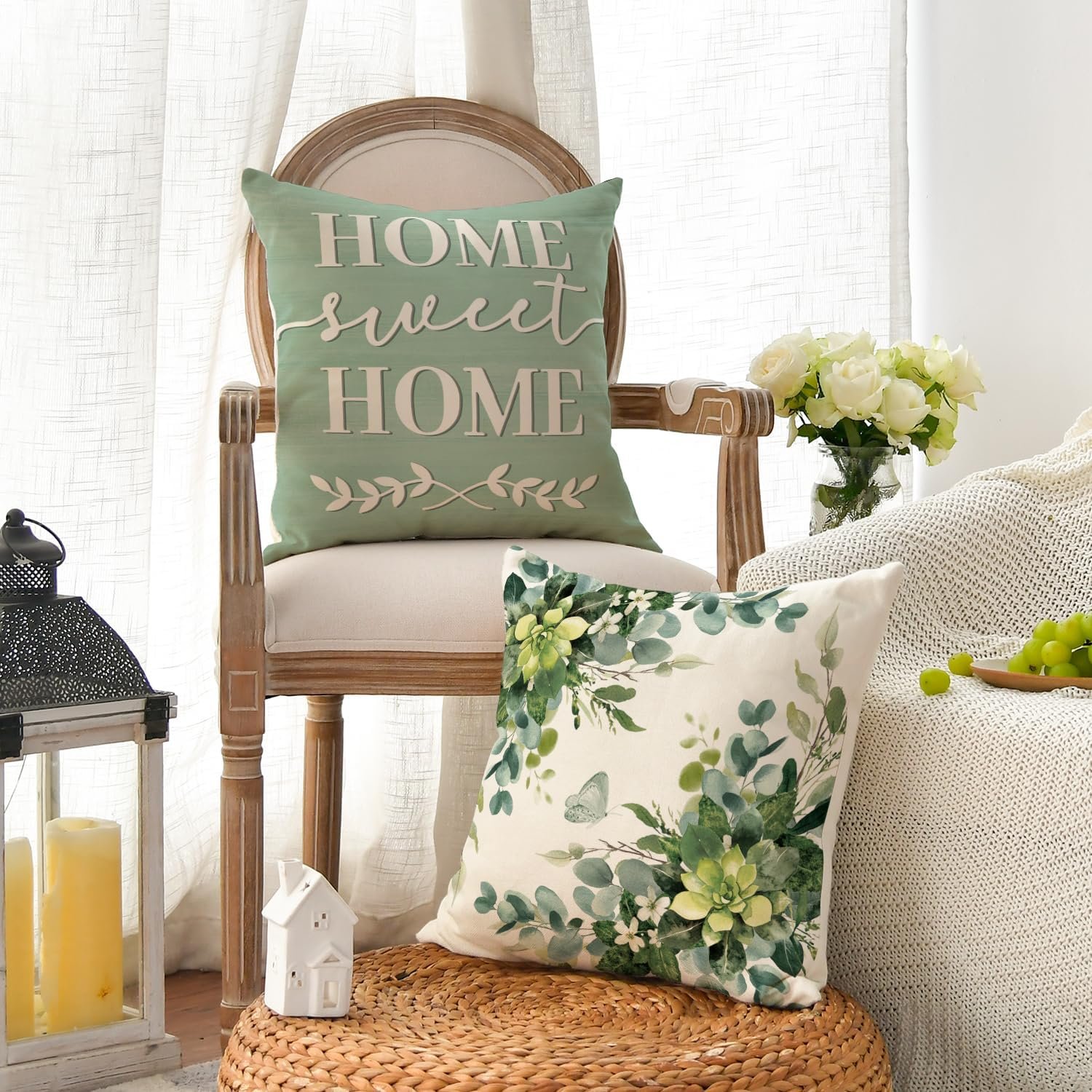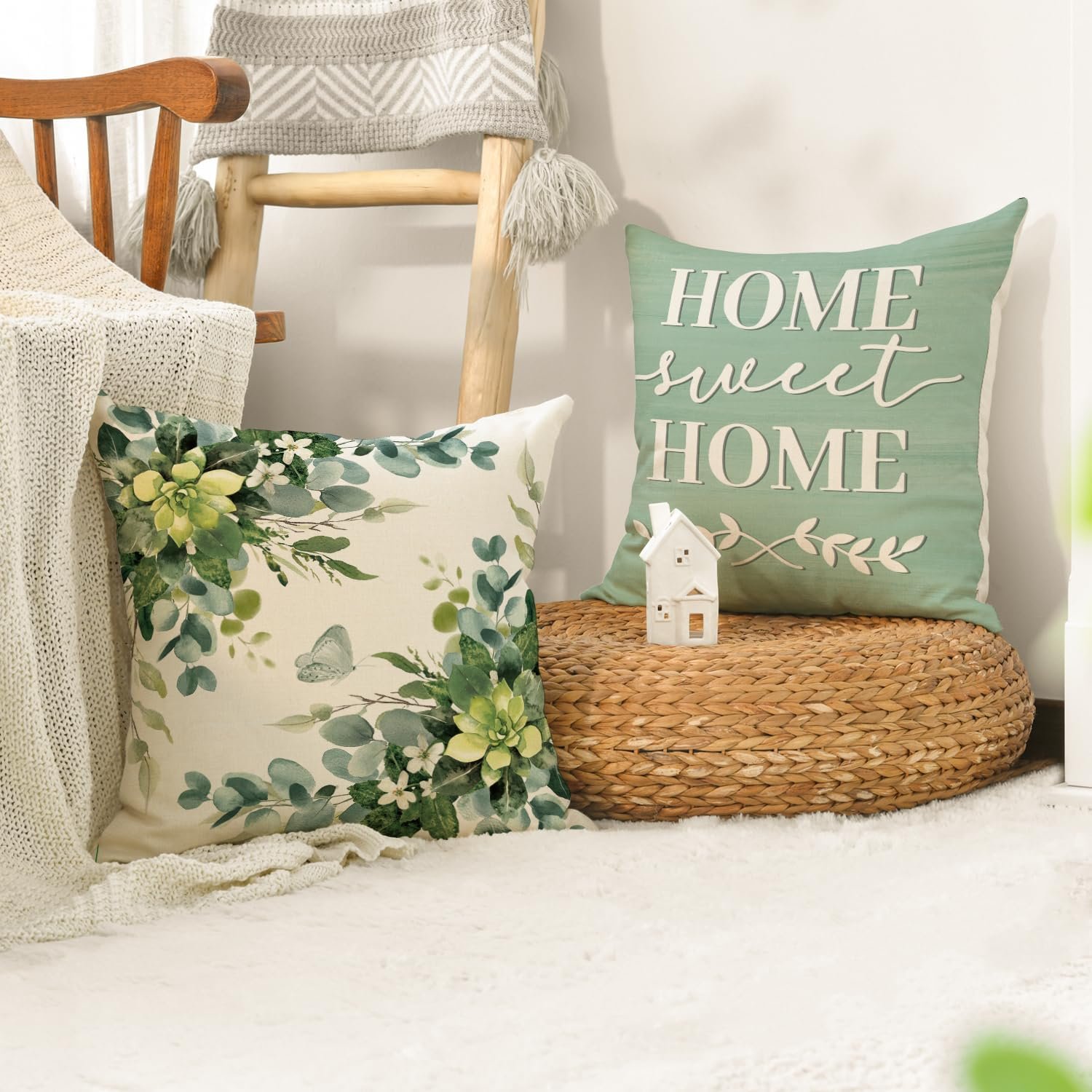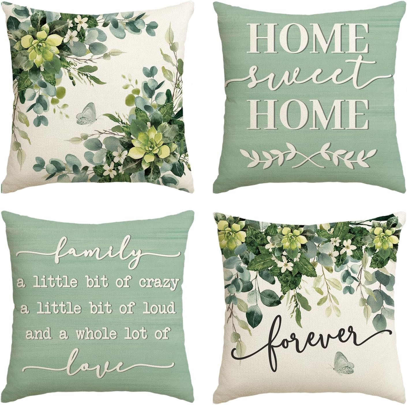 AVOIN colorlife Home Sweet Home Eucalyptus Leaves Throw Pillow Covers, 18 x 18 Inch Seasonal Spring Summer Motto Green Cushion Case for Sofa Couch Set of 4