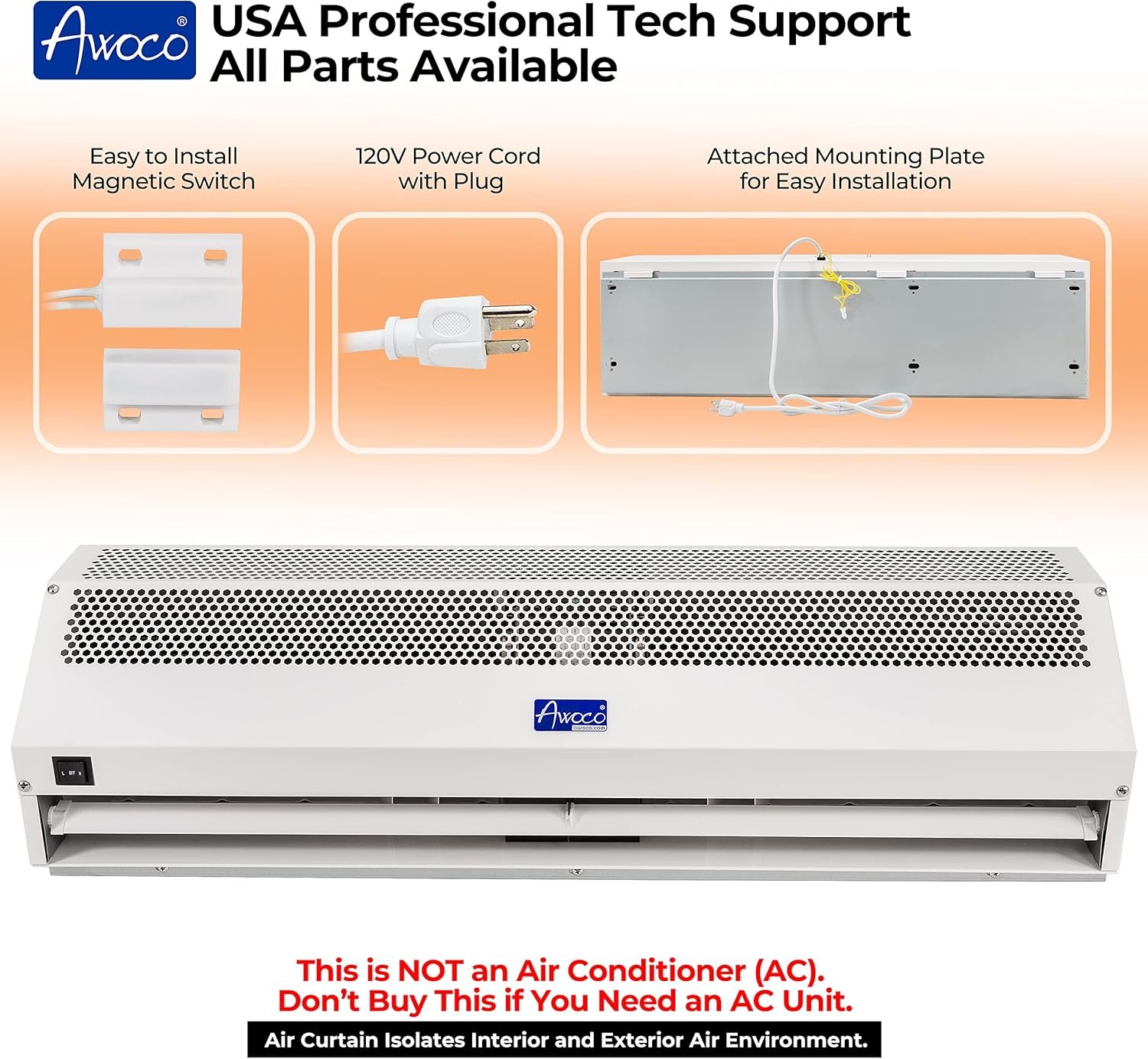 Isolate Interior from Exterior Air: This air curtain is not an air conditioner, It won’t generate cold and hot air. Air curtain is a powerful fan that forcing a high speed air stream over the entrance to isolate the interior and exterior air environment while blocking 90% of Hot or Cold air, dust, and smoke.