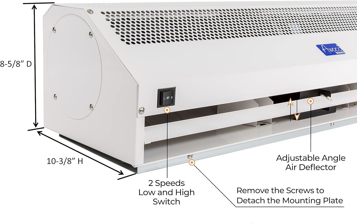 Easy Installation: Refer to Technical Specification User Manual, installation should be easy. 1) mount the detachable mounting plate securely. 2) hang the air curtain up. 3) install the optional door switch and connect to the dedicated 2 wires. Fireproof and anti-erosive powder coated metal case, easy to clean slim body.