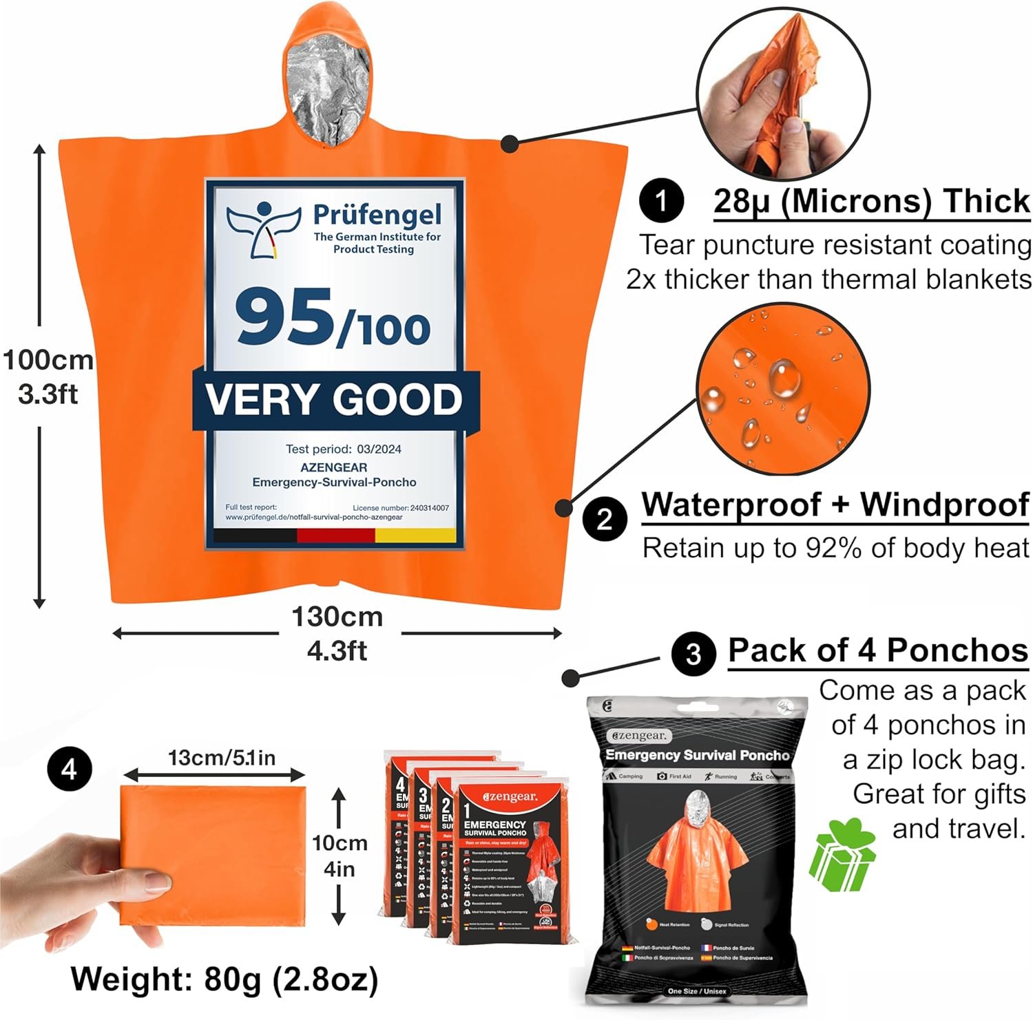 RETAINS UP TO 92% OF BODY HEAT – With its thick (28 microns) advanced thermal mylar foil coating, this poncho can retain up to 92% of your body heat, helping to keep you warm in cold temperatures.