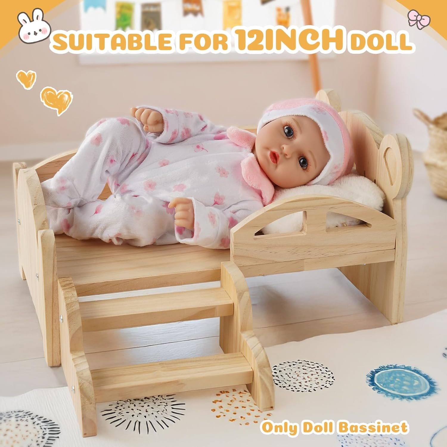 Quality Materials: This cradle bed is made of high-quality wood, with thornless edges and texture. The material is environmentally friendly and healthy, non-toxic and harmless, making it safer for babies to play with dolls