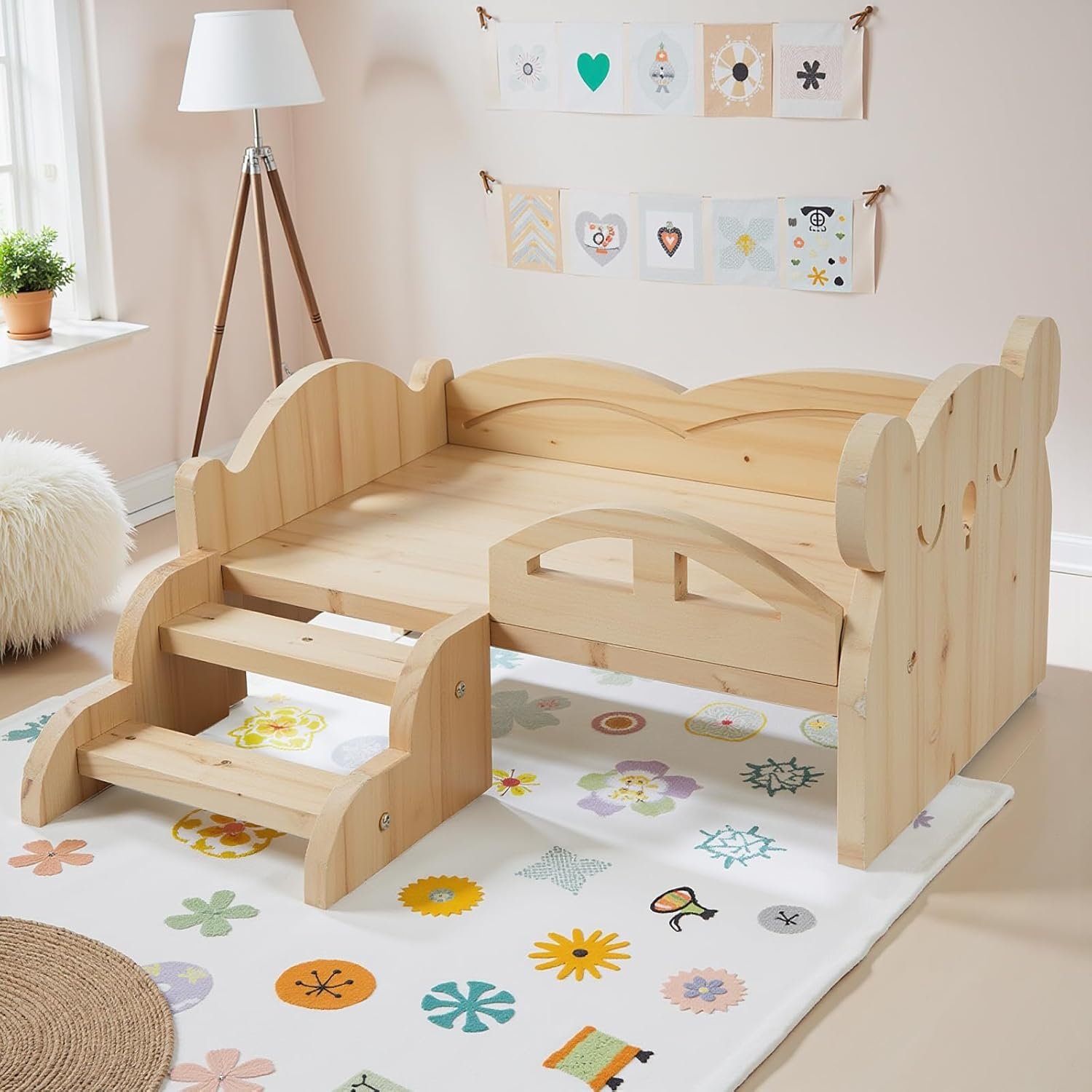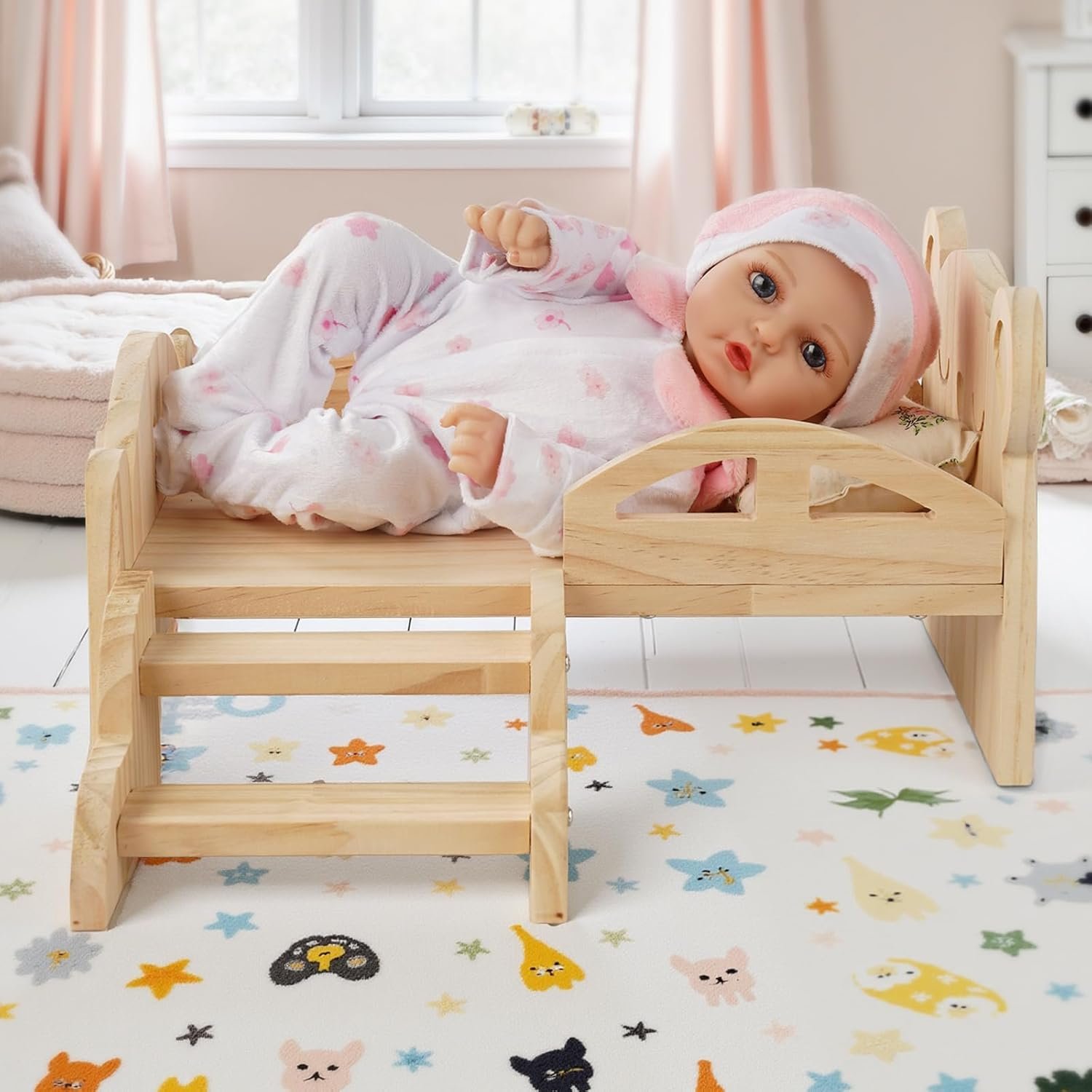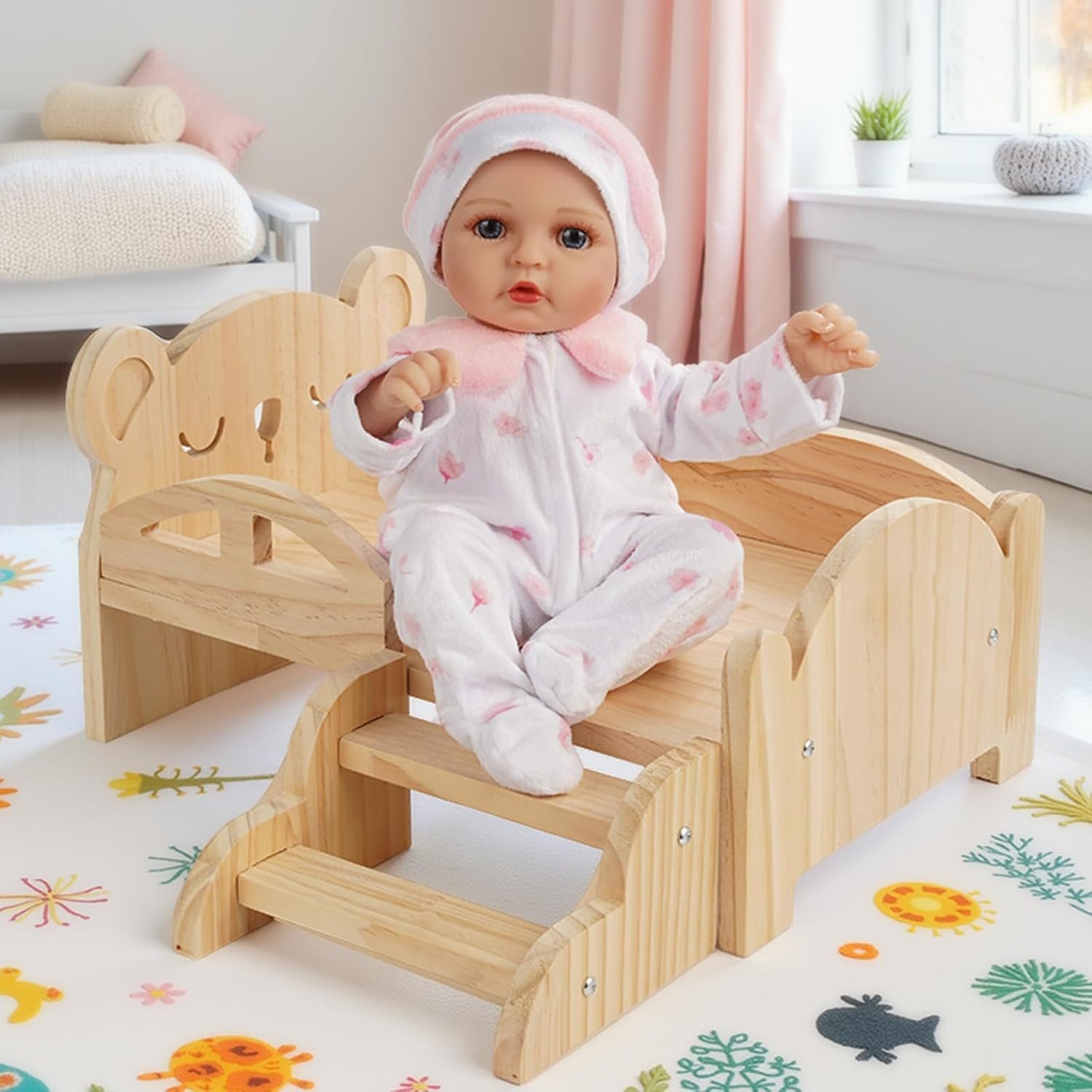 Bear Hollow Design: Equipped with stairs, the playability of taking care of the doll is enhanced, and the hollow design of the bear makes the doll bed look more attractive to the baby