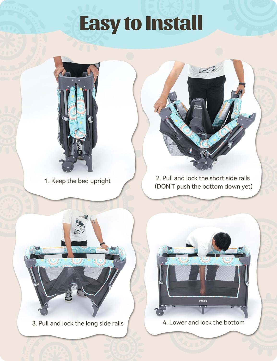 【Easy to Assemble】CoziBB 5 in 1 bassinet bedside sleeper features an integrated frame that can be deployed without any tools. We have prepared a video for you showing you the process of unfolding and stowing a crib. Pay attention to the order of operations! Easy to unfold – First pull up the four side fences of the playpen, press the fence to ensure it is locked and not fall, then push down the base; Easy to fold – first twist the button at the bottom, then press down on the four sides of the playpen