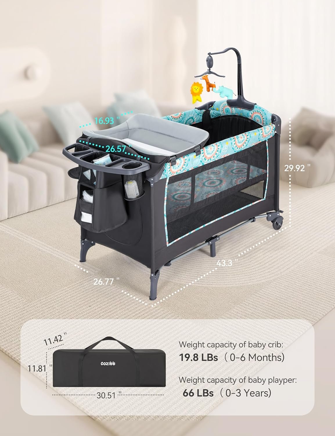 【5-in-1 Multifunctional Crib】CoziBB pack and play is specially designed for babies aged 0-3 years old, providing a safe place for babies to sleep and play. This is a product that integrates a crib + bedside bed + changing table + play yard and playpen. Its multiple functions can meet your various needs and accompany your baby’s growth