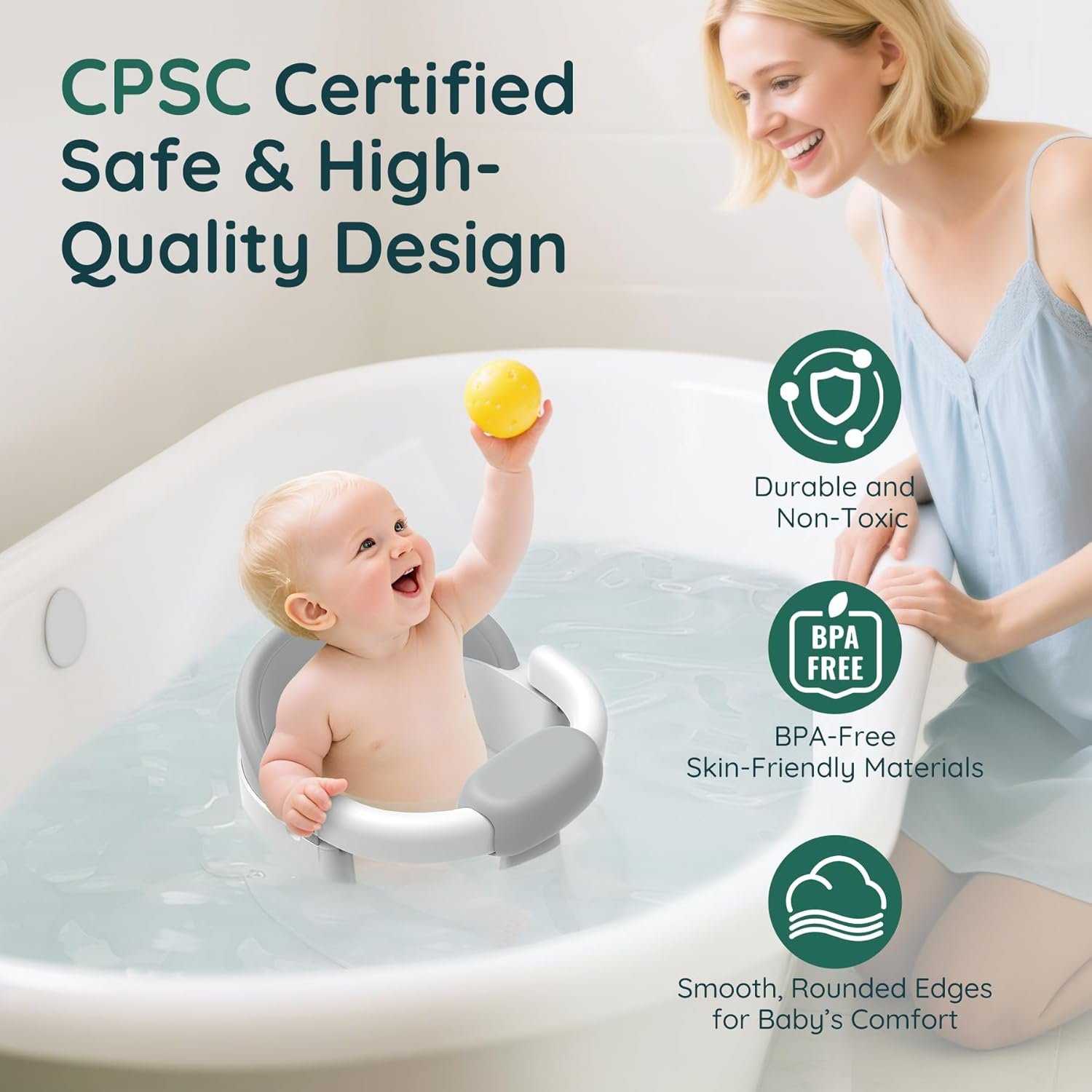 Gentle Materials, Baby-Safe Design: Made from BPA-free PP+TPR, the seat is skin-friendly and durable. Smooth curves and soft-touch materials reduce friction and pressure on your baby’s skin, while the ergonomic backrest keeps them upright and comfortable throughout the bath.
