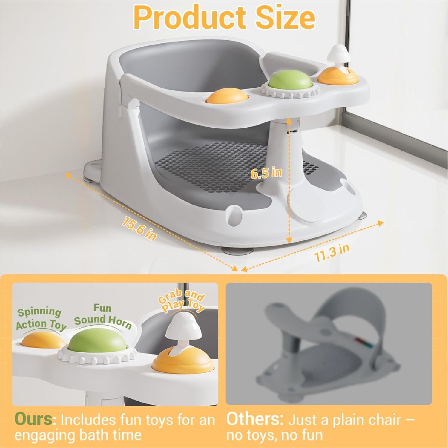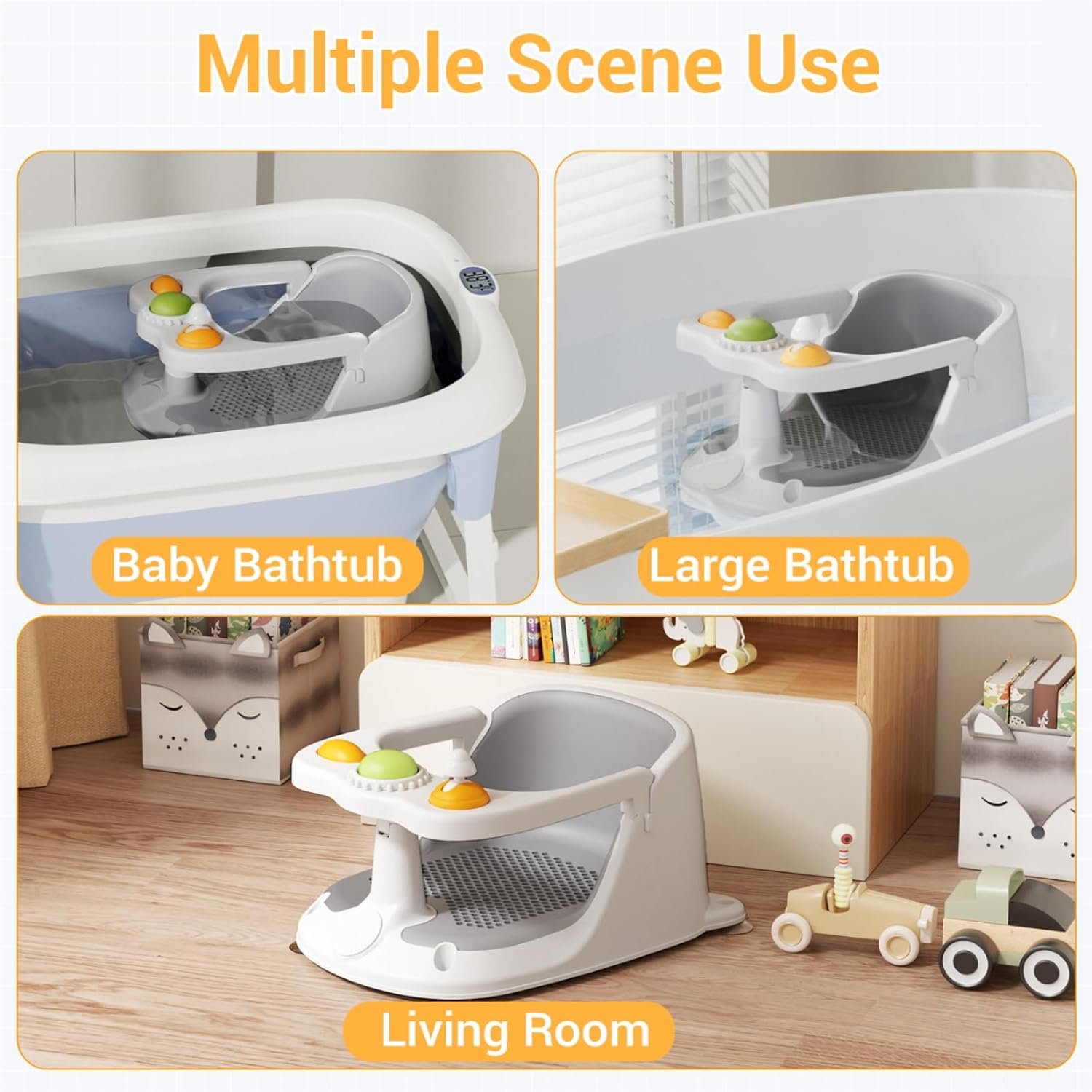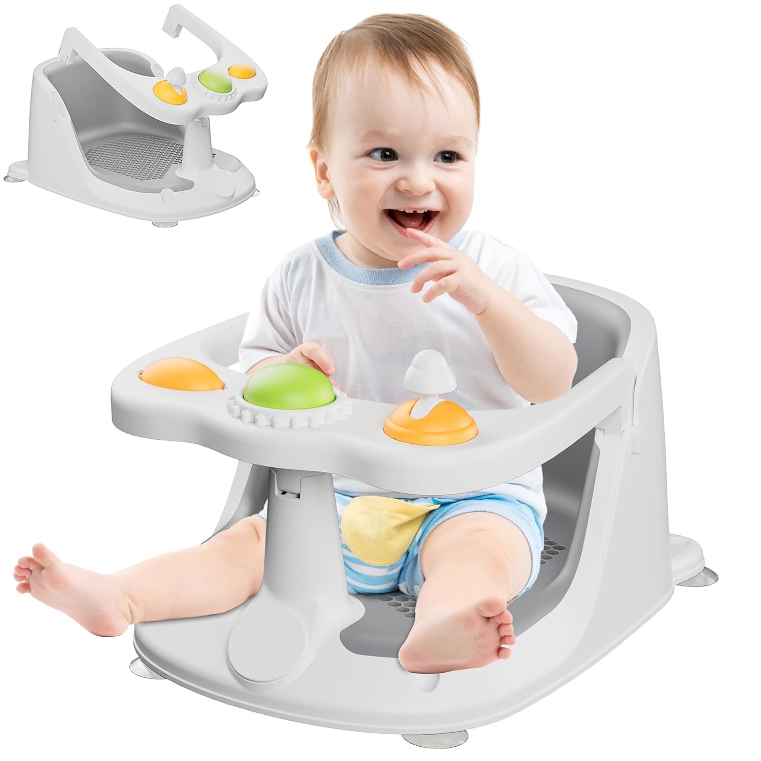 Solve Baby’s Bathing Troubles: Designed for bath seats for babies sitting up, this baby bath seat offers stable support while keeping little ones entertained. A grip-training handle, rotatable knob for hand strength, and a press-to-sound button offer fun sensory play, Toddler bath seat make your baby sit securely in the tub, allowing parents to clean every part of their little one without constantly holding them. This reduces the need for extra help, making bath time easier, safer, and more efficient,making it a must-have baby item for bath seat for babies 6 months & up.