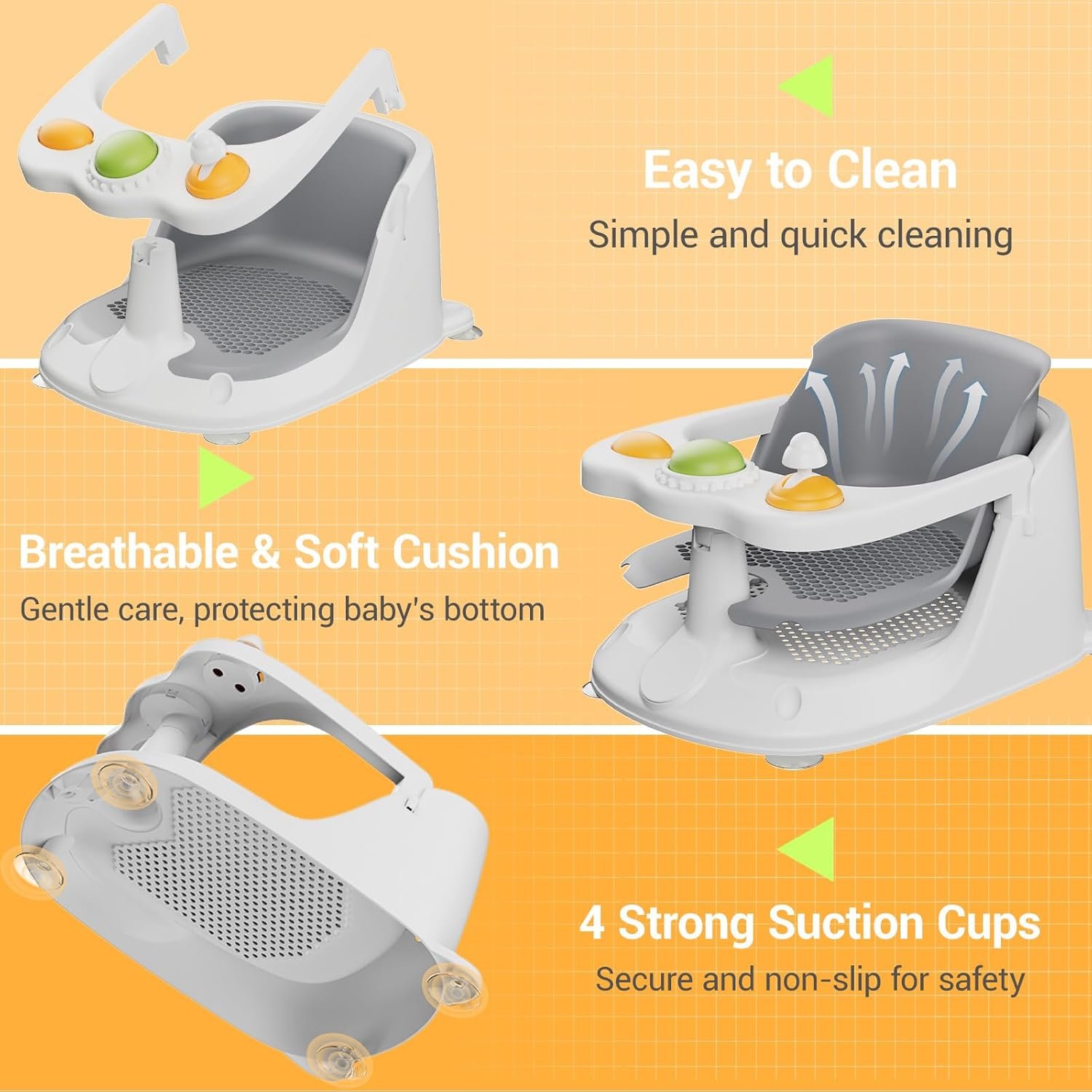 NON-SLIP STRONG SUCTION CUP: Designed with 4 strong suction cups at the base, this sit up bathtub seat for baby firmly attaches to smooth bath surfaces to prevent slipping or movement—ensuring a stable and worry-free bathing experience. The high backrest and armrests provide added support and comfort for both baby and parents