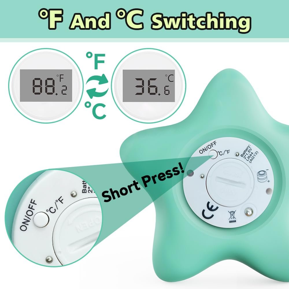 【Auto Turn Off】The bath temp thermometer turn on automatically when put in the water,it will turn off after 5 minute out of water.No need press any button.And the bottom button of digital water thermometer offer convenient of switch between °F and °C