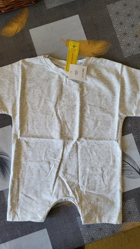I am delighted with this purchase, the T-shirt is made of cotton. I recommend this romper; the top is a slightly oversized T-shirt, perfect for summer.