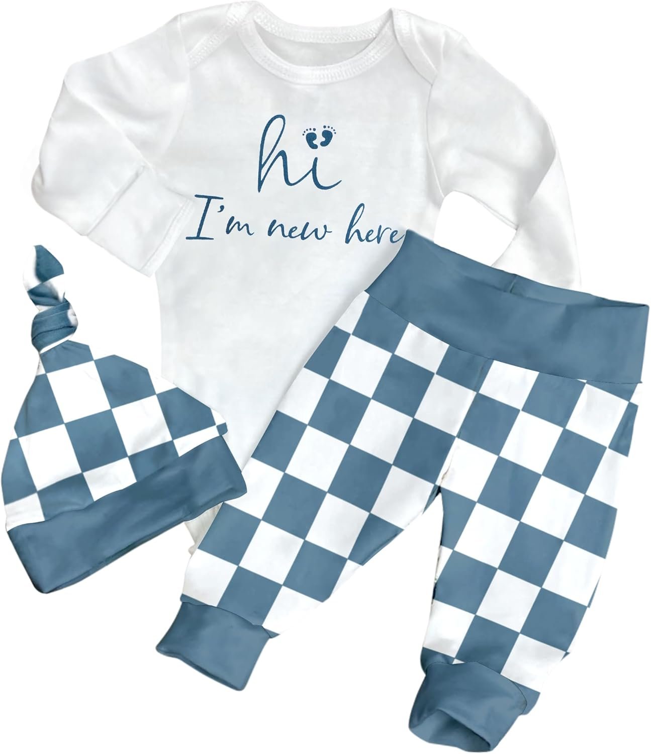 hi I’m new here Romper Onesie Blue and White Checkerboard Plaid Pants Hat