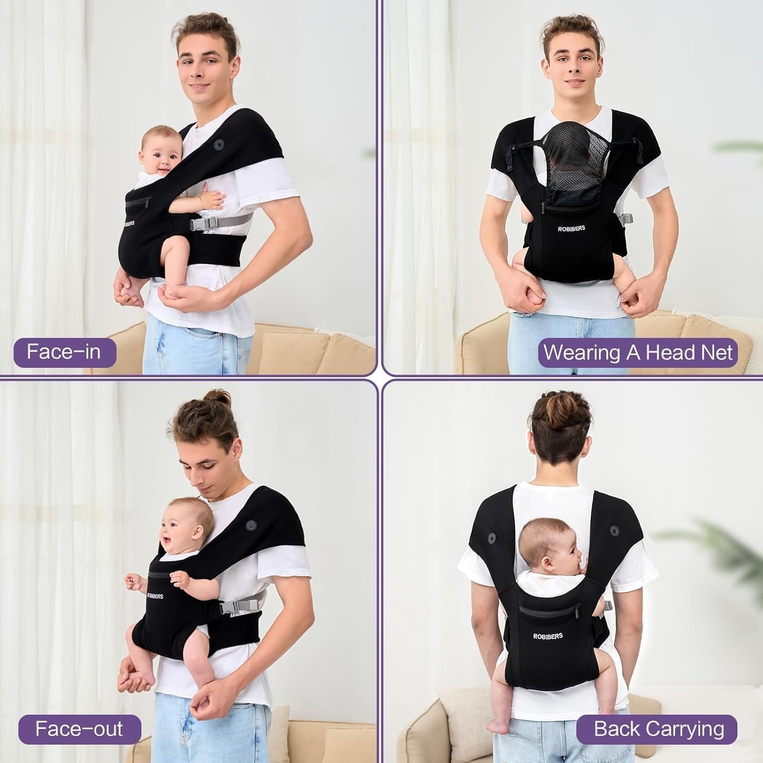 FOUR DIFFERENT USAGES: Face inward while wearing a head net, face-in and face-out, and back carrying. Easy to wear, just fasten the buckle. ROBIBERS newborn carrier suitable for daily life, outdoor activities and travelling, freeing parents’ hands and allowing new parents to enjoy their leisure time