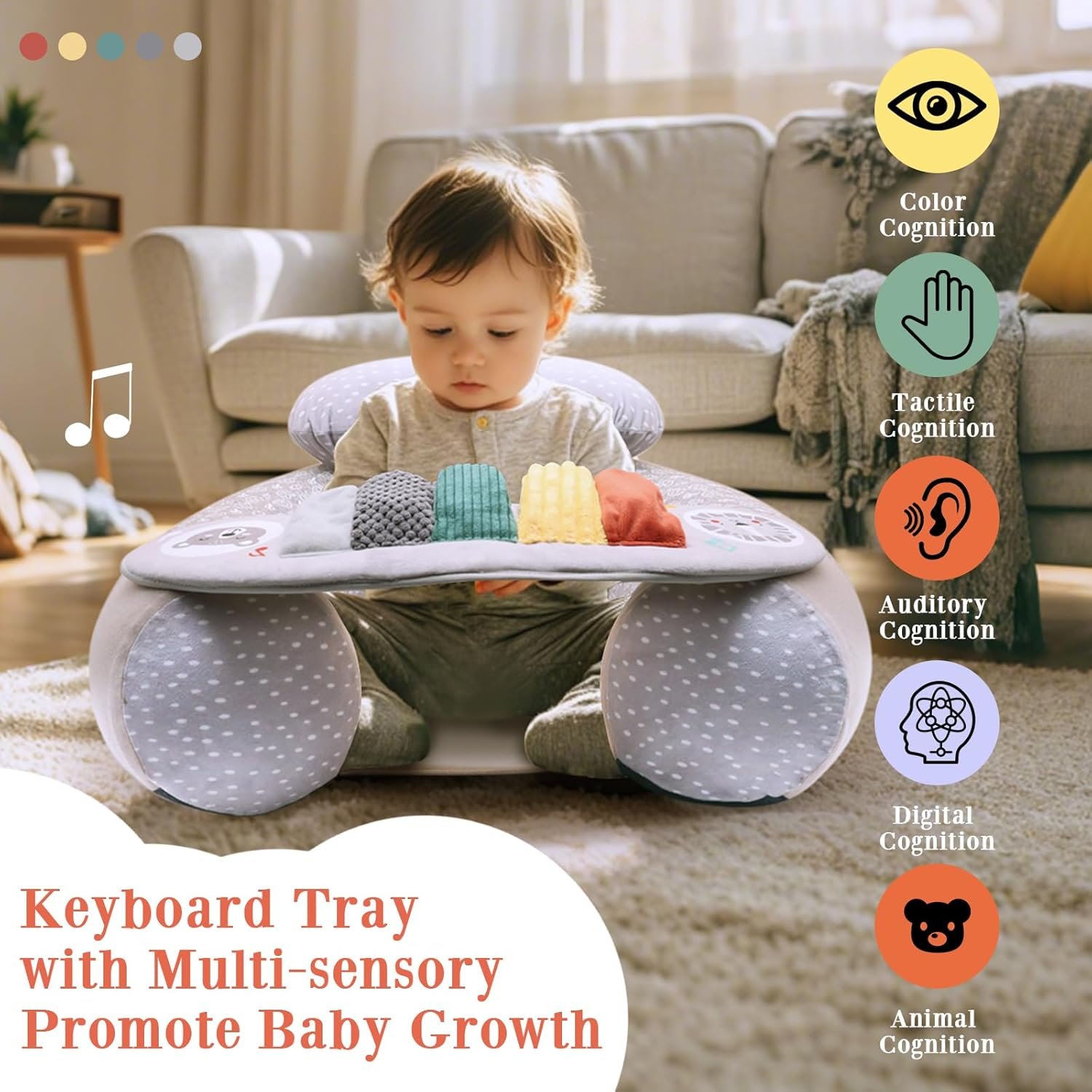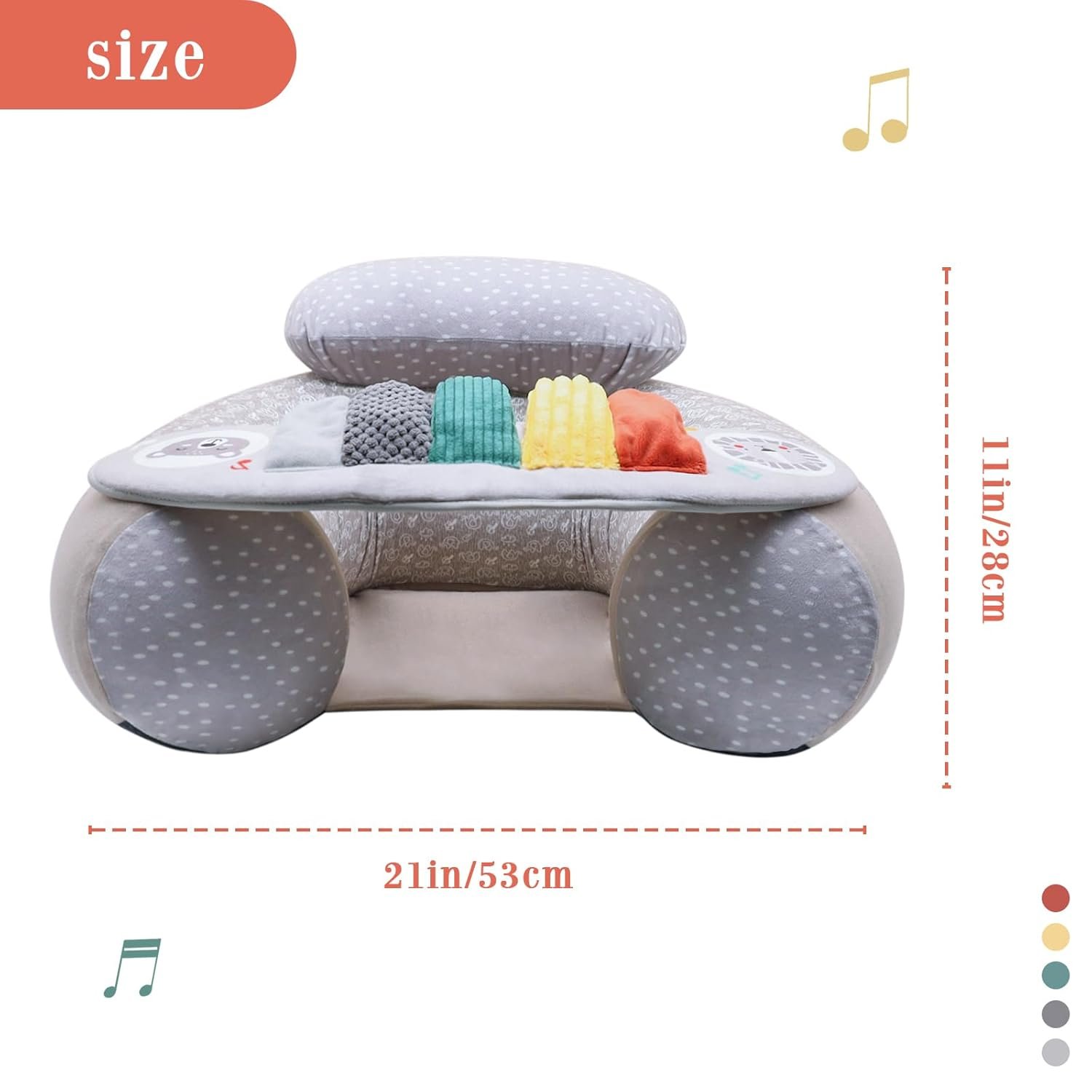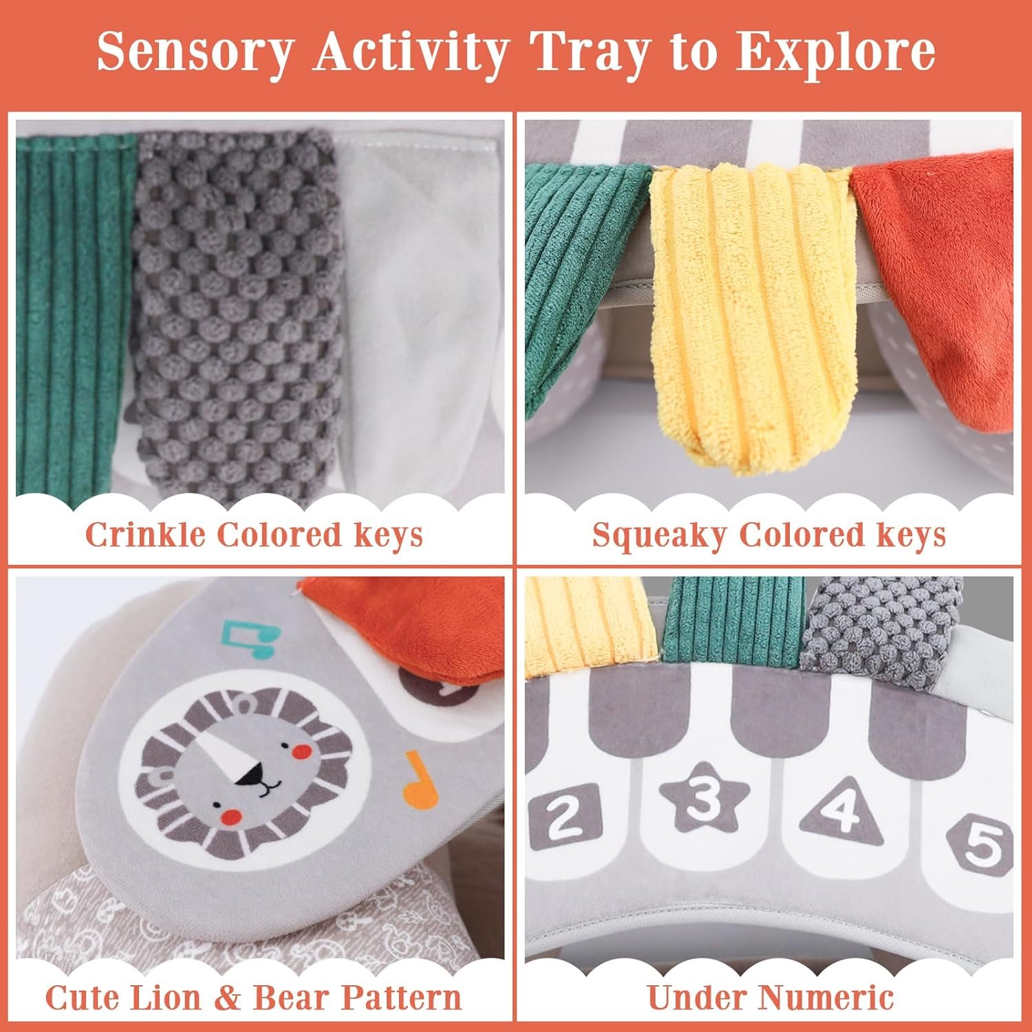 DETACHABLE SENSORY TRAY: Inflatable baby activity seat is designed with different colors and tactile piano keys, built-in BB squeaker, crinkle and rattle, and there are numbers under the keys, accompanied by cute bears and lions on both sides, sit up chair for baby 3 months can promote the baby’s sensory development and cognitive ability, and at the same time, it also enhances parent-child interaction