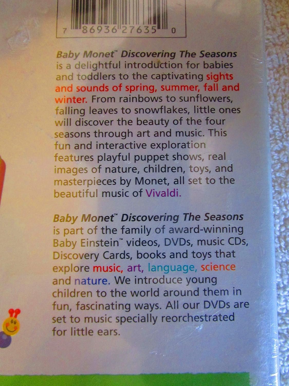 As babies grow and change, so does the landscape around them. From fiery red leaves to falling snowflakes; from flowers in bloom to fireworks in July, every season of the year has its own special magic just waiting to be discovered. BABY MONET™ takes little ones on a sight-and-sound-filled journey through spring, summer, fall and winter using playful puppet shows, real images of nature, children, toys, and masterpieces by Claude Monet set to excerpts from composer Antonio Vivaldi’s timeless “The Four Seasons.” This virtual breath of fresh air lets you and your baby share the beauty of each season as you explore its wonders together! END