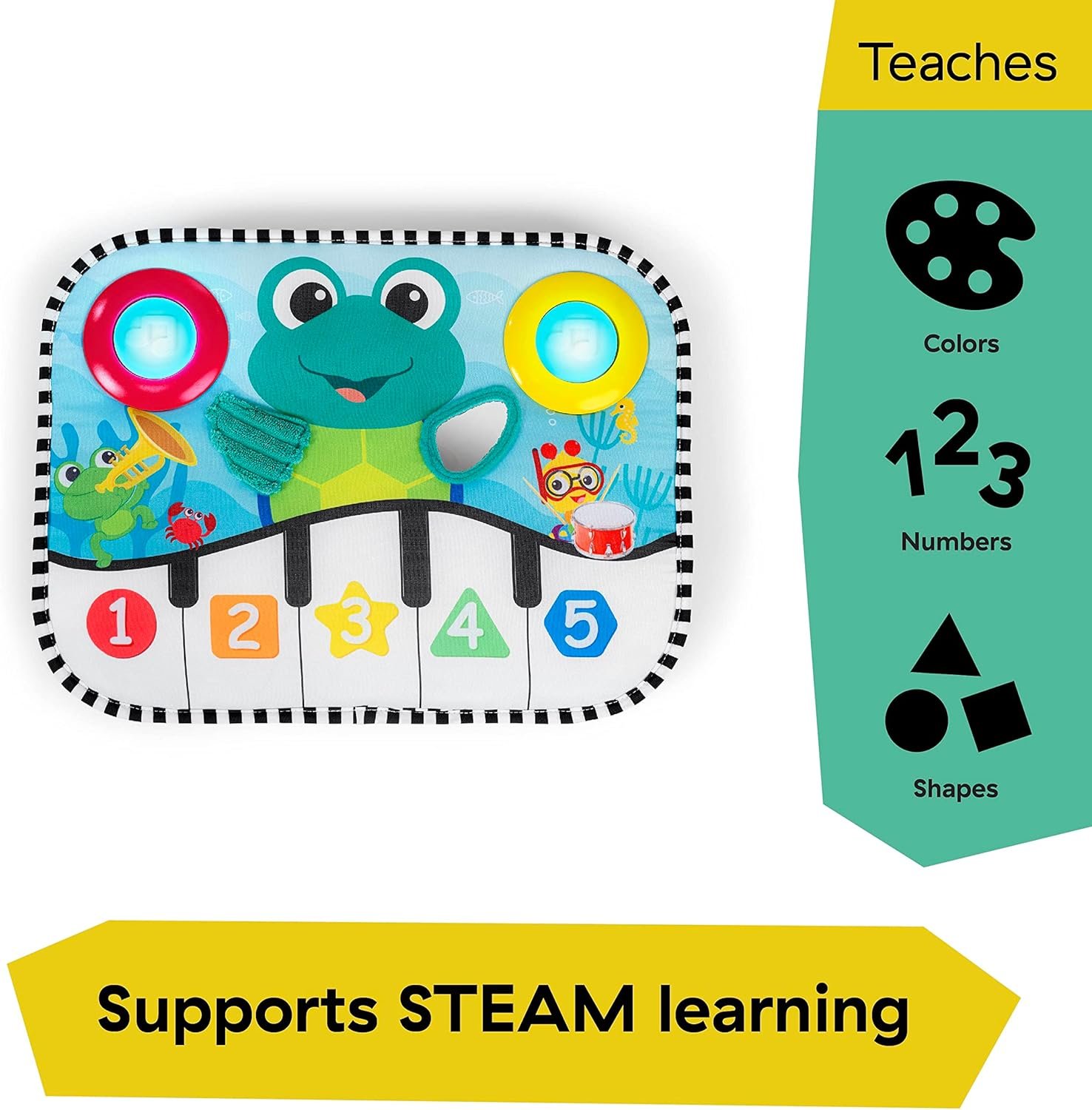 Baby will get a kick out of musical discovery with Baby Einstein Ocean Explorers Neptune’s Kick & Explore Musical Kick Pad & Crib Toy, a soft, unisex musical toy that helps baby explore melodies, create original songs, and learn letters, numbers, and shape names. Featuring Neptune the Turtle from the Baby Einstein Ocean Explorers show, baby can jam and discover 3 languages during crib play, tummy time, or sitting up. Includes 3 ways for baby to play. In Piano Mode, baby can create original marimba sounds with every kick. Choose Melody Mode to help baby play along to pre-recorded jingles and sounds, or Discovery Mode to introduce shapes, colors, and numbers in 3 languages – English, French, and Spanish. This vibrantly-colored kick pad easily attaches to baby’s crib via ties and transforms into a floor toy for tummy time or seated play. Requires 3 AA batteries.