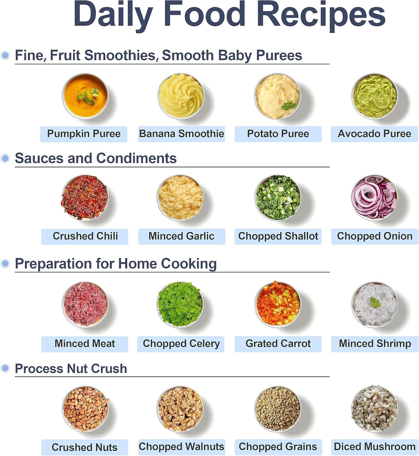 【Easy to Use and Clean】With a simple one-button operation, you can easily use the baby food blender to blend, puree, or chop your baby food. The mixing bowl, blades and lid are completely separated from the body and can be easily disassembled and cleaned. This baby food maker also comes with a recipe book to help new parents get better at using it.