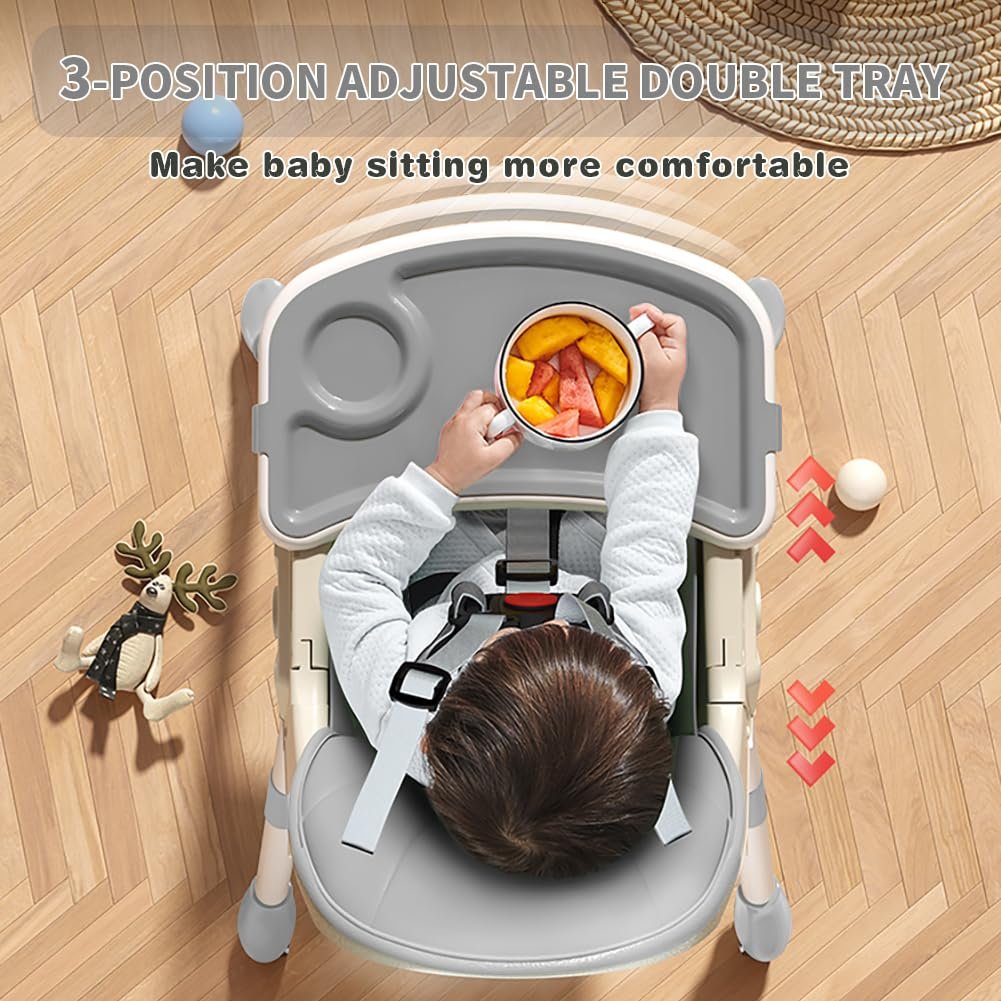 [EASY TO CLEAN AND STORE] We are well aware that taking care of babies is such a huge and complex task, so quick cleaning and storage is essential, the double removable tray allows for cleaning without baby having to leave the baby feeding chair. The PU leather cushion is waterproof and can be quickly cleaned by simply wiping down with a dry cloth or wet wipe. The compact foldable high chair can be folded away in a matter of seconds to save space when not in use.