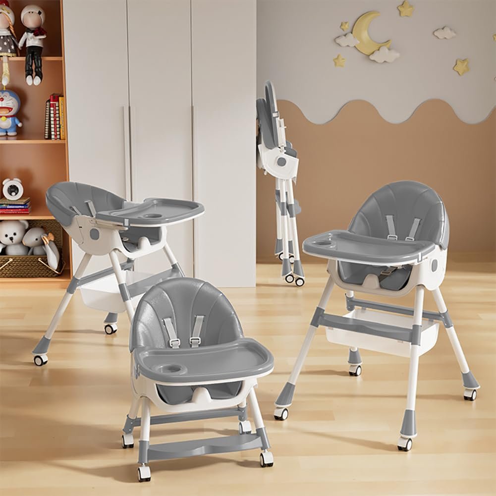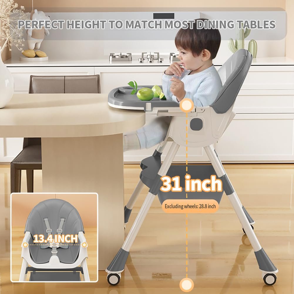 Baby High Chair, 5 in 1 High Chairs for Babies and Toddlers, Travel Foldable High Chair with Foot Rest, Detachable PU Cushion, Double Removable Tray, Adjustable Height & Recline, Locking Wheels