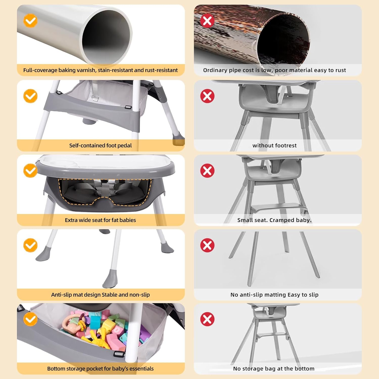 Momjoy baby high chair is equipped with a five-point harness and non-slip feet, ensuring your child’s safety during meals. The high chair is constructed from high-quality materials, providing a sturdy structure that withstands long-term use