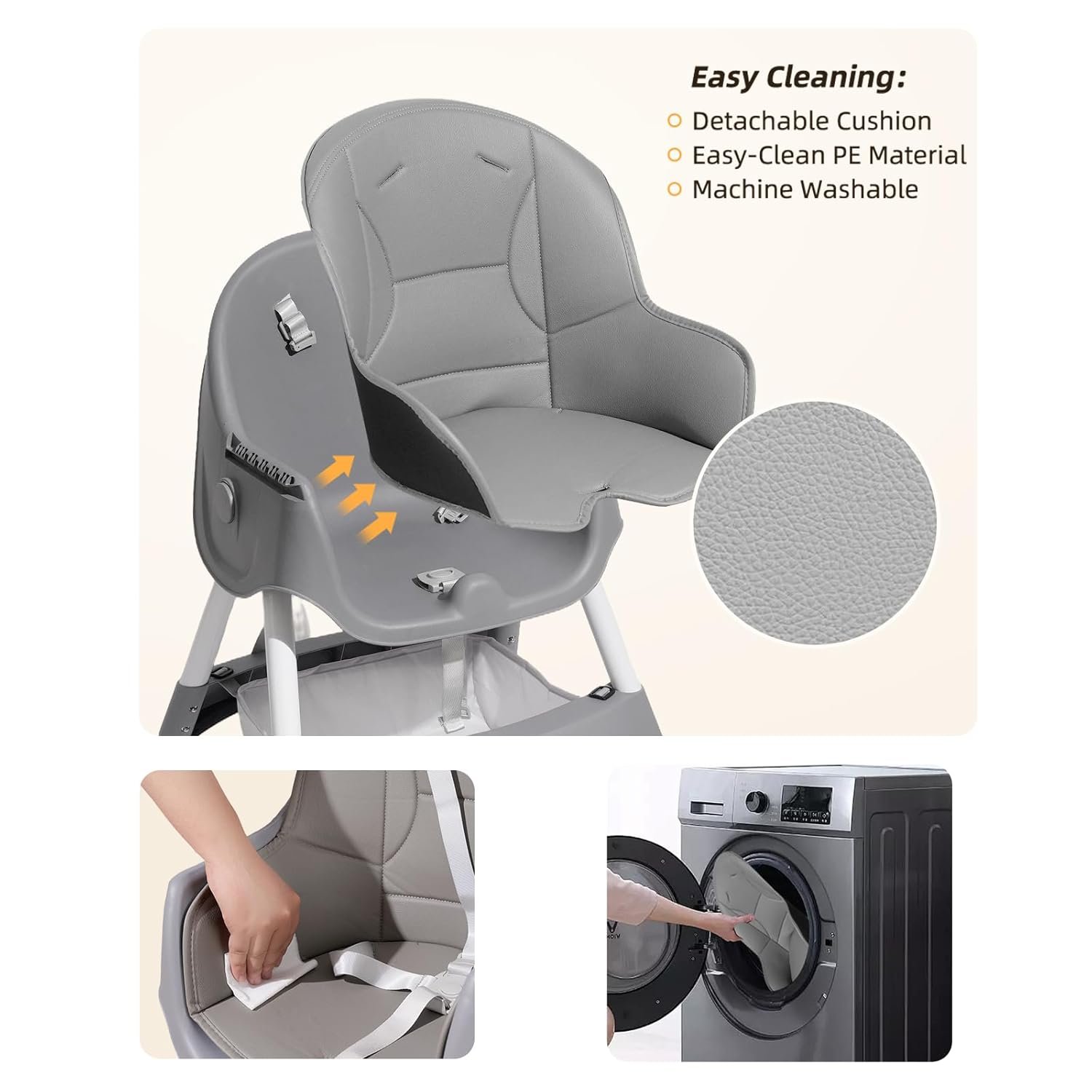 Momjoy baby high chair has a removable tray and wipeable seat cover for quick clean-ups. The tray is dishwasher-safe, and the seat cushions are machine washable (remove large food debris first). Ideal for parents seeking “easy-to-clean high chairs.