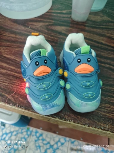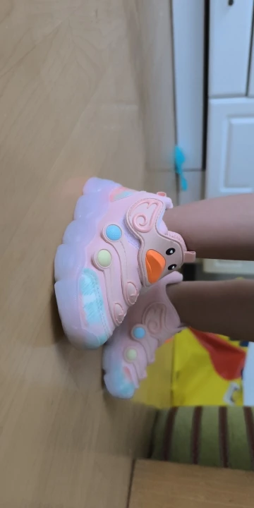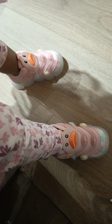Super light, shines brightly, wide for wide feet, and the adhesive is strong enough to hold even a thin foot well. The child is delighted.