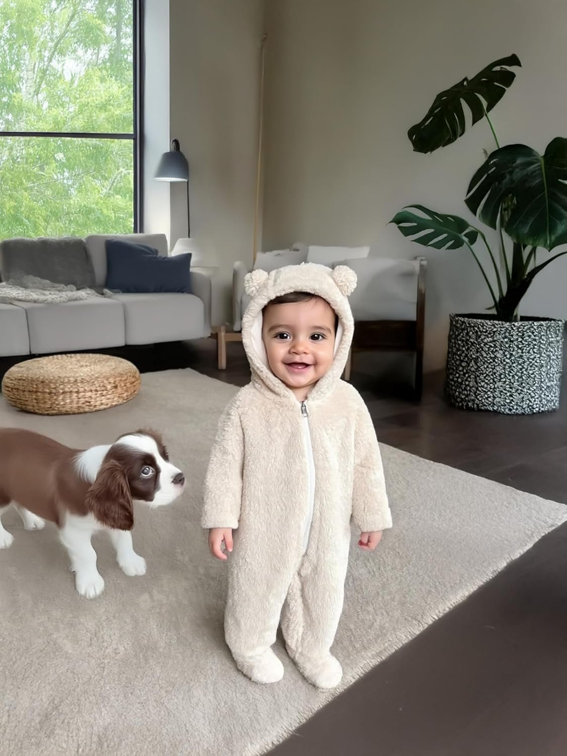 Hooded Design: Keeps your baby’s head warm and adds an extra layer of protection against the cold.Zipper Closure: Easy to put on and take off, making diaper changes hassle-free.Cute Bear Ears: Adorable design elements that make your baby look even more charming.