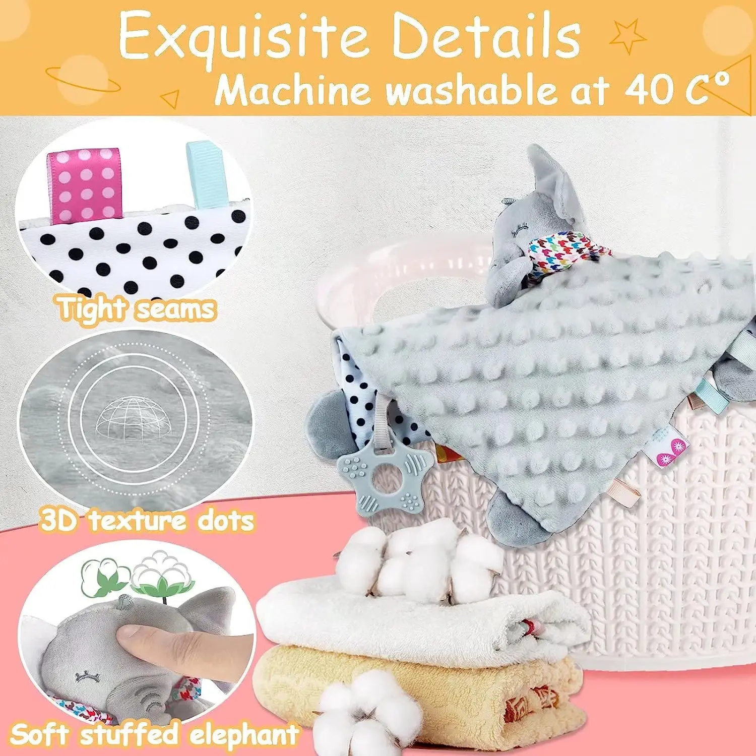 Baby Security Blanket with Tags Soft Plush Stuffed Animal Toys Lovey Soothing Sensory Toy Cute Minky Dot Fabric Cuddle Snuggle
