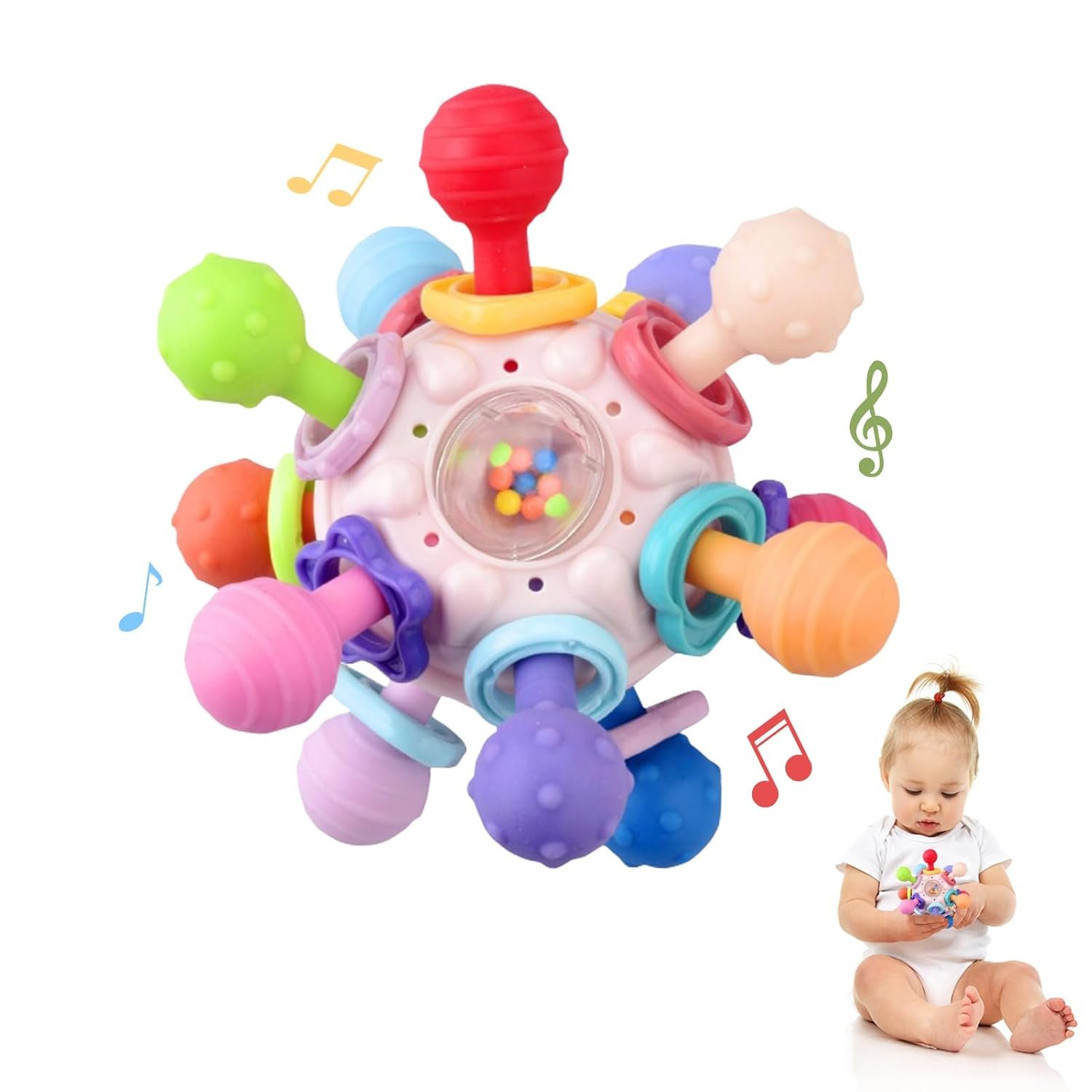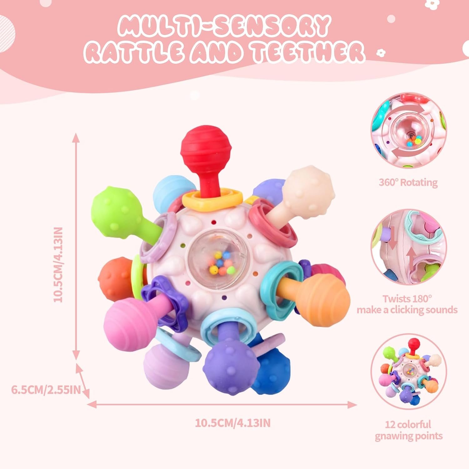 Multi-Sensory Baby Toy: This baby sensory toy is designed to stimulate your baby’s senses with 12 bright colors and textured silicone balls. The rattle ring, twisting clicking ball, and rotating ball provide additional sensory fun.
