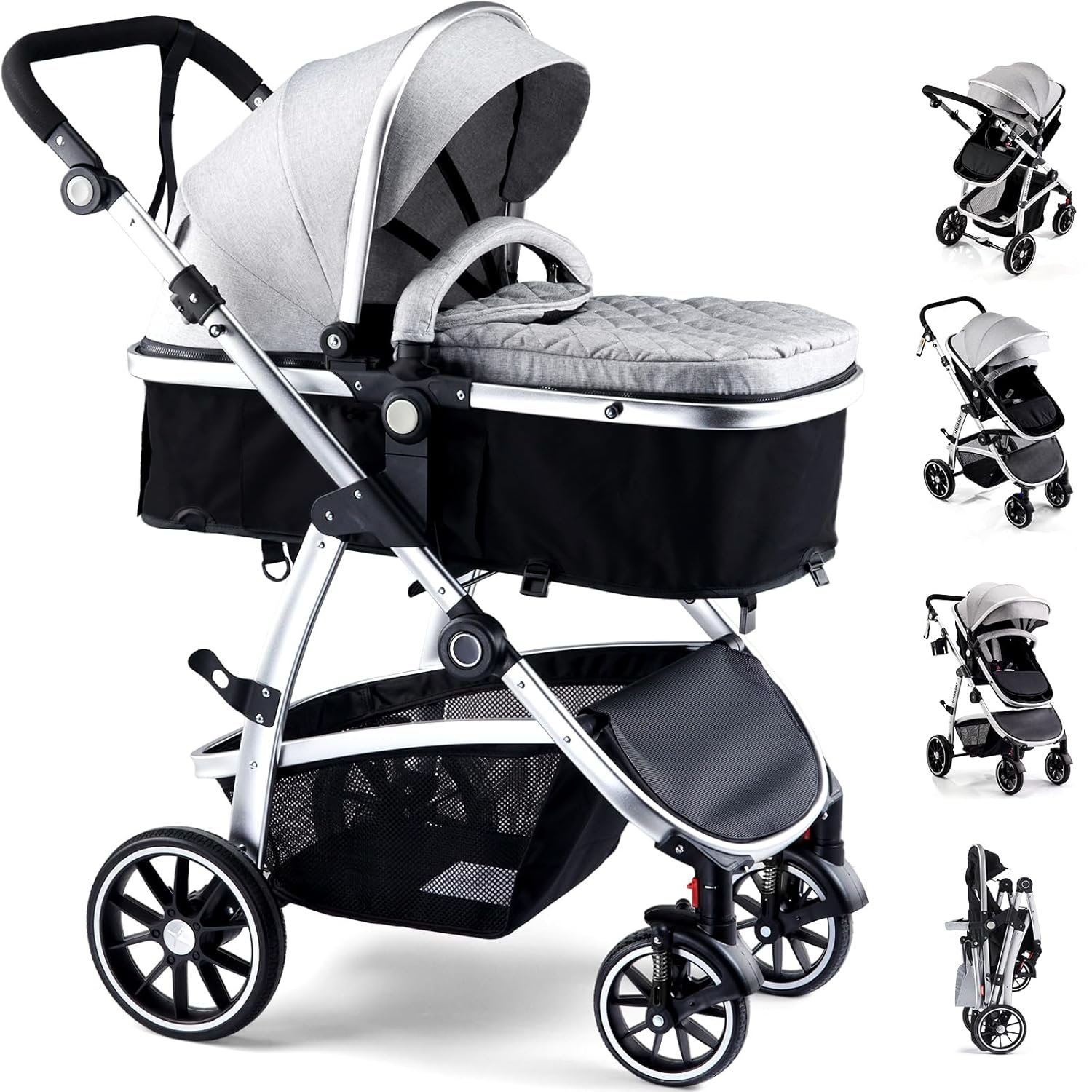 2-IN-1 CONVERTIBLE STROLLER: This stroller for newborns can switch between bassinet mode and seated mode. The footrest provides additional support for the baby, and the reversible bassinet pram allows the baby to face you. The handlebar adjusts to 4 different heights to accommodate parents of various statures.