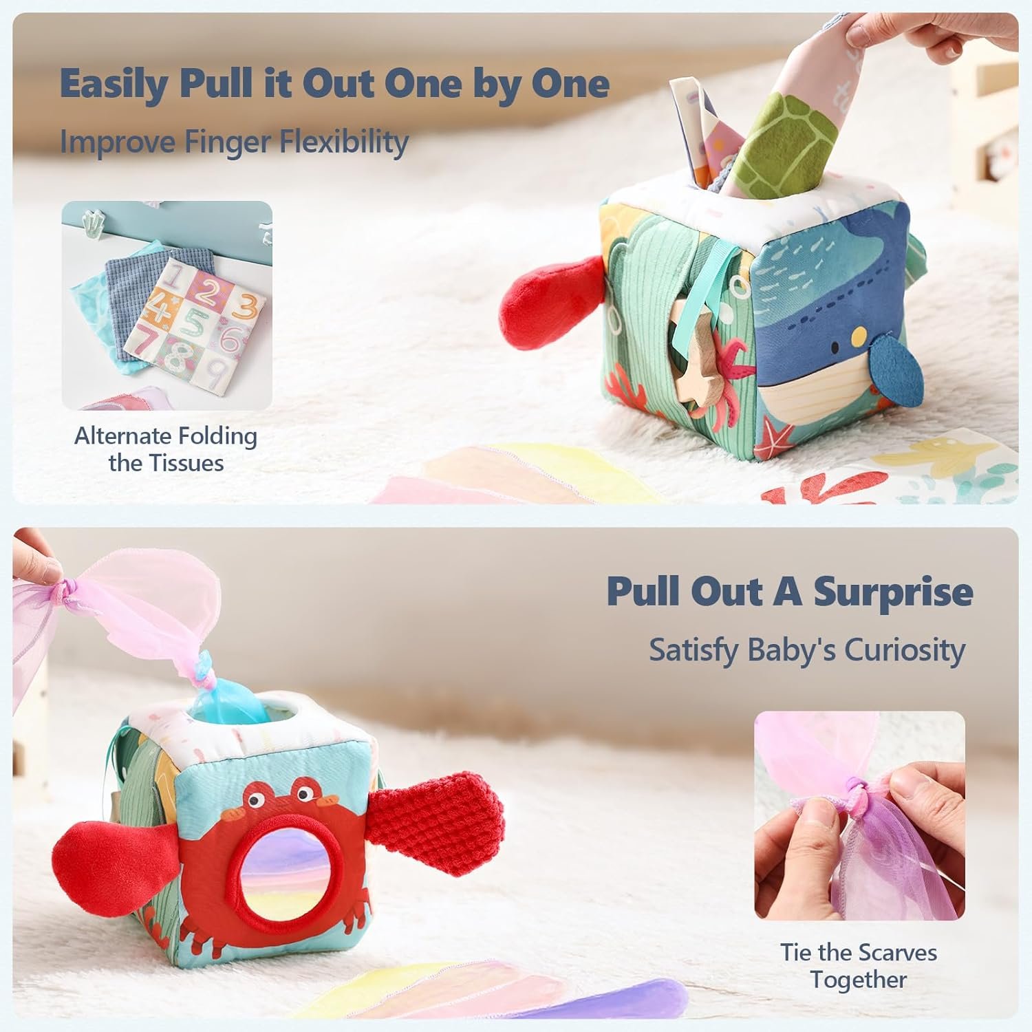 Baby Tissue Box Toy, Montessori Sensory Toys for 6-12 Months, 6 Month Old Baby Must Haves, with Crinkle Paper, Silk Scarves, Safety Mirror, Perfect Early Learning Gift