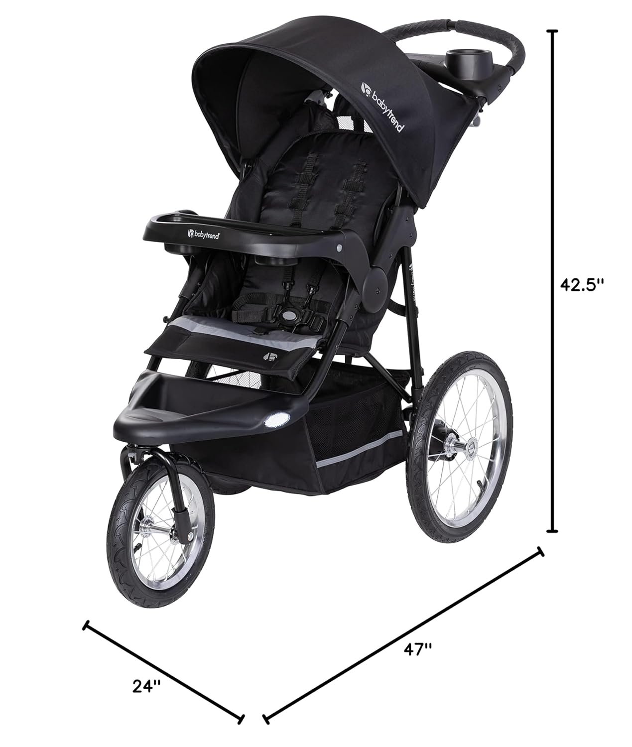 The Baby Trend Expedition Jogger is designed with style and security for you and your child. It has a parent tray with 2 cup holders and covered storage compartment and an extra-wide ergonomically shaped rubber grip for comfortable handling. The child’s tray has 2 cup holders to keep beverages and snacks handy and also accept Baby Trend EZ-Lift infant car seats to make into a travel system. The jogger also includes a 5-point harness and a rotating canopy with visor that can be adjusted to shield your child from the elements. It has a convenient storage basket under the seat, offering ample space to carry feeding bottles or other baby essentials. The stroller easily folds into a compact unit for easy storage. Its front wheel swivels for easy maneuvering. The wheel can also be locked to offer in-line performance.