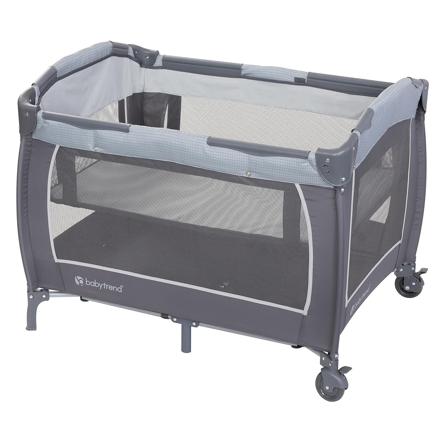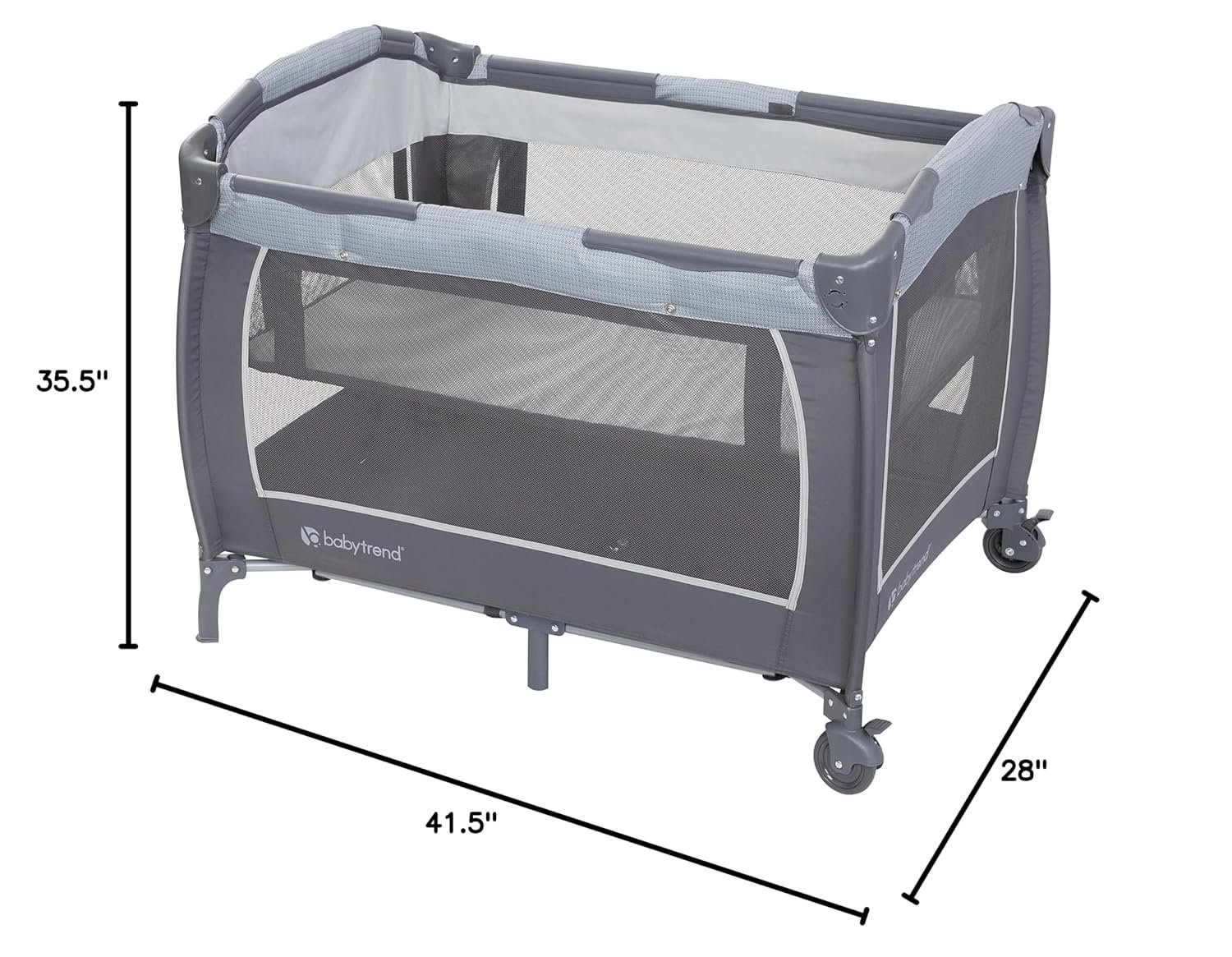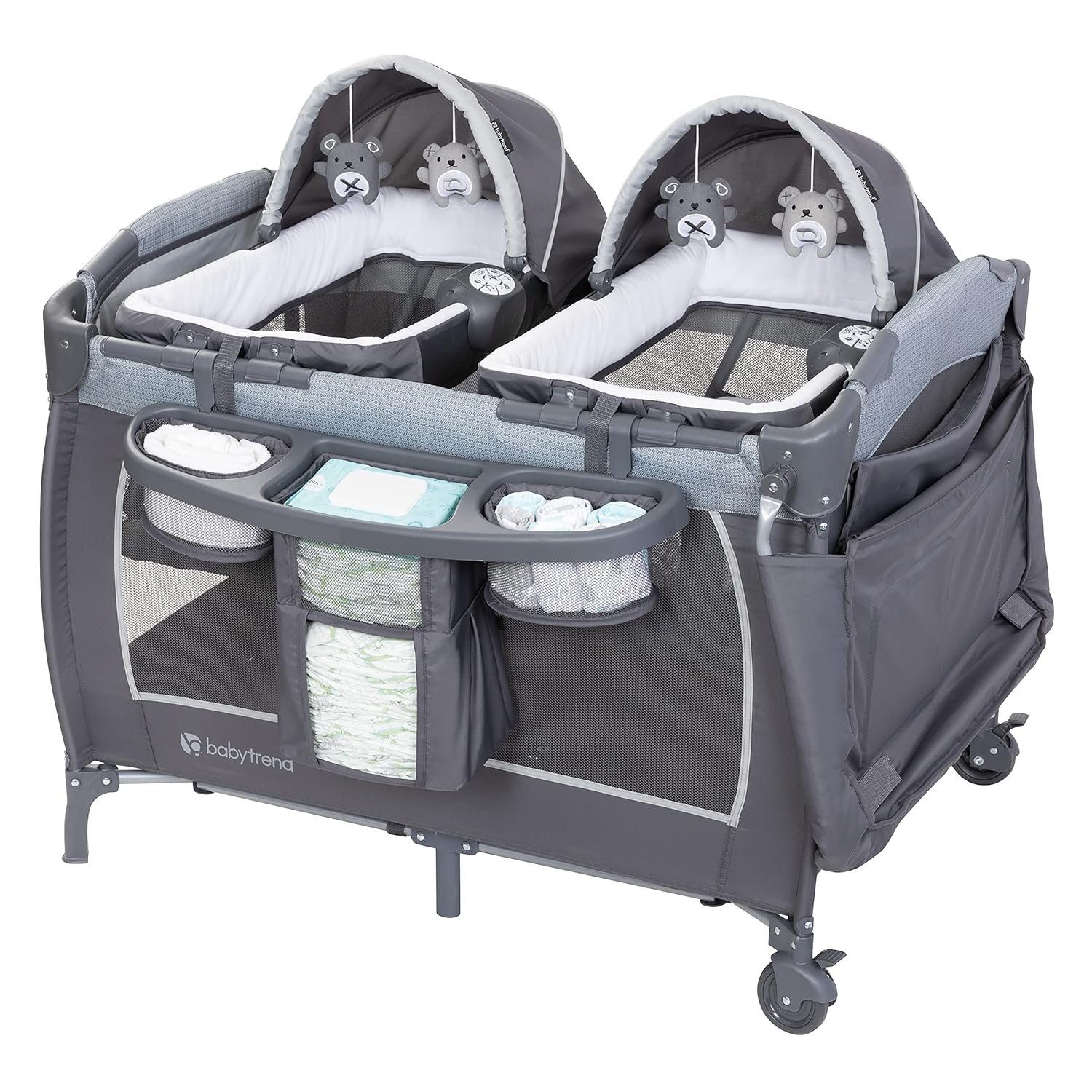 The Baby Trend Lil Snooze Deluxe III for Twins features two Removable Rock-A-Bye Bassinets with a canopy, plush fabric and mesh sides for proper ventilation and two hanging toys. The playard includes a removable full bassinet that allows it to convert to a full-size playard, a flip over changing table and a deluxe parent organizer to hold all of the essentials. Your twin babies will enjoy the electronic music center with volume control, nightlight, and vibration which includes two styles of music and nature sounds. A convenient travel/storage bag allows you to take the Lil Snooze Deluxe III Twins on-the-go and it can be moved from place to place with large wheels and secured with brakes.