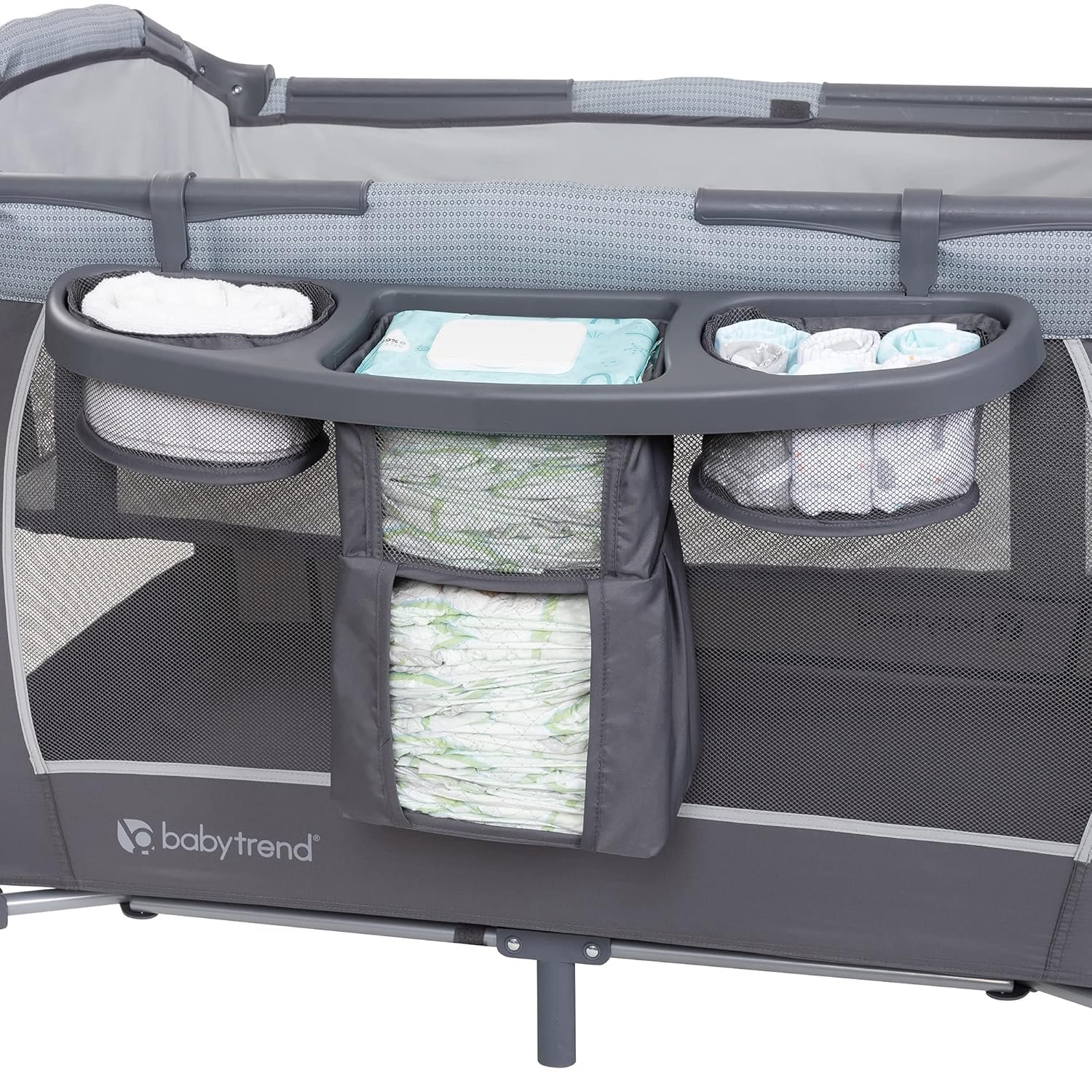 Removable full-size bassinet converts to a full-size playard space