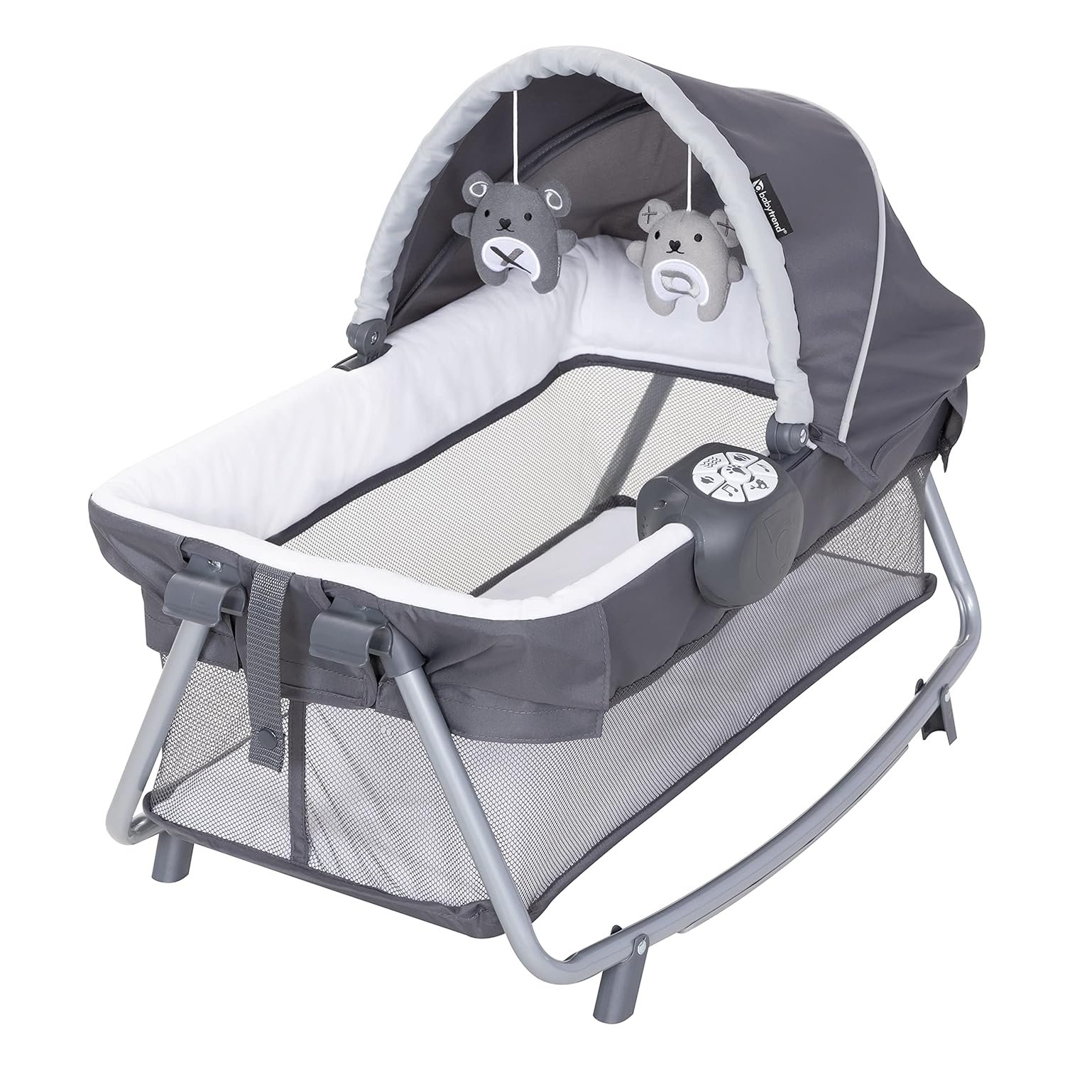 Each Rock-A-Bye Bassinet includes two hanging toys to stimulate grasping and reaching