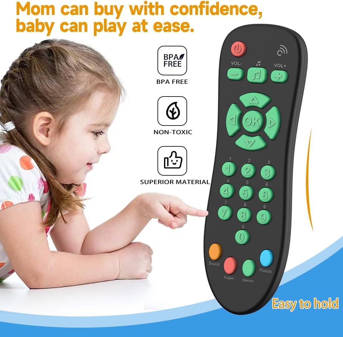 MUSICAL AND MULTI LANGUAGE: Our play remote includes soft light and many sounds, help strengthen important senses like sight and hearing. This toy remote for baby with English, French and Spanish, keeps baby busy for a long time.