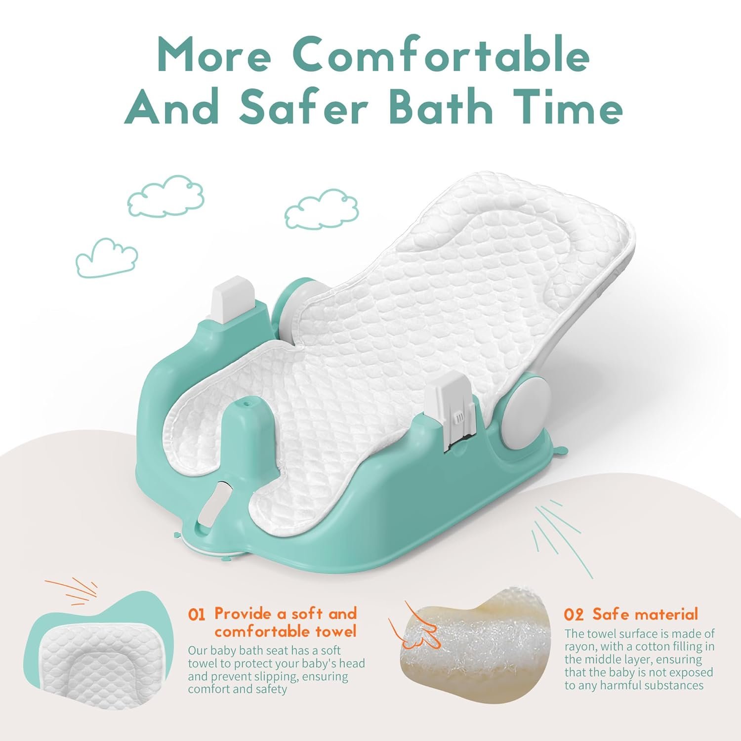 Enhancing Your Baby’s Comfort: Our baby bath seat features a soft and comfortable towel that effectively protects your baby’s head while providing additional grip to prevent slipping out of the seat, ensuring a more comfortable and secure bathing experience