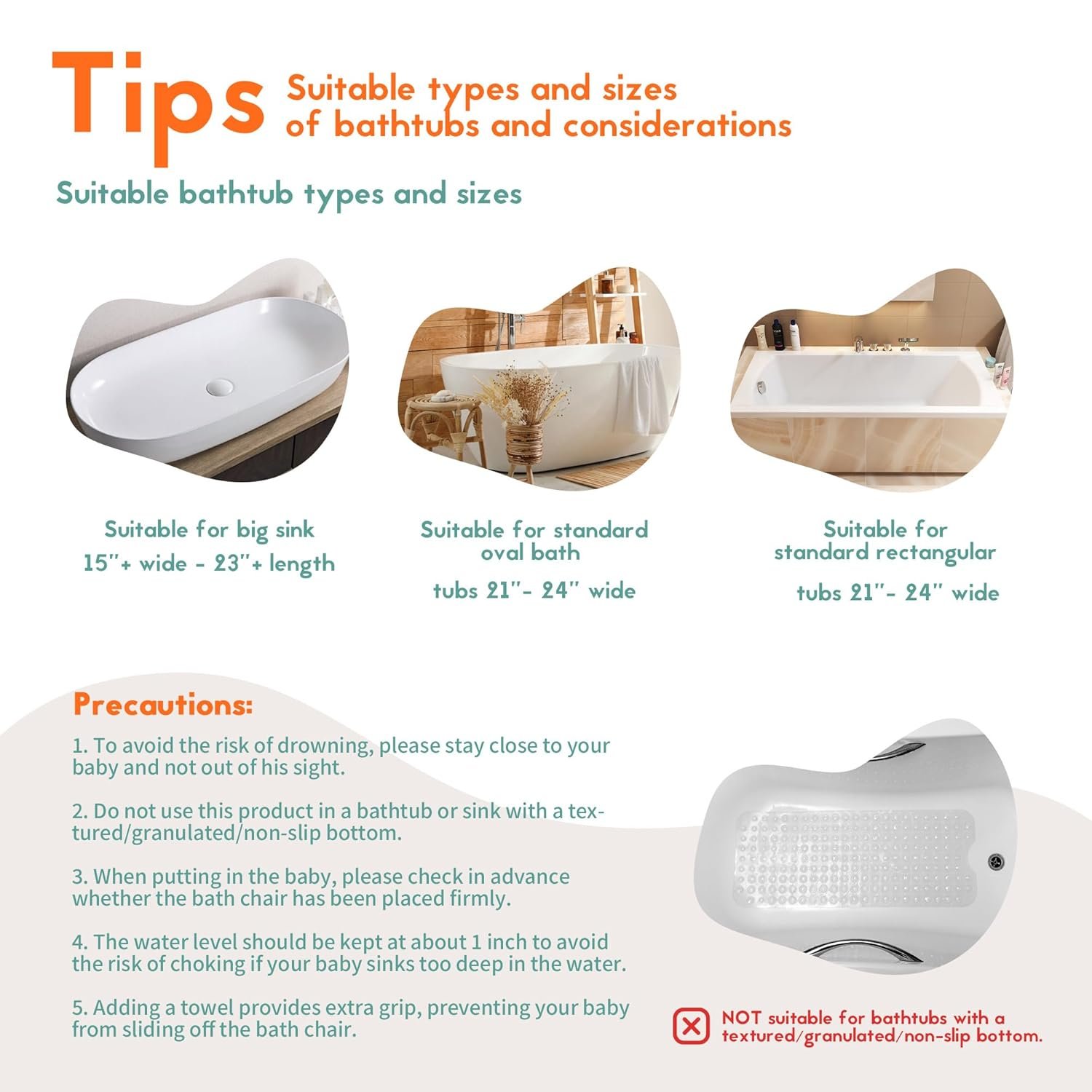 Reassure parents: the configuration of high-quality locking structure suction cups and non-slip soft pad, so that your baby safely sitting on the seat, can effectively avoid the risk of baby backward tumble (not suitable for bathtubs with a textured, granulated, or non-slip bottom. The uneven surface prevents the suction cups from adhering properly)