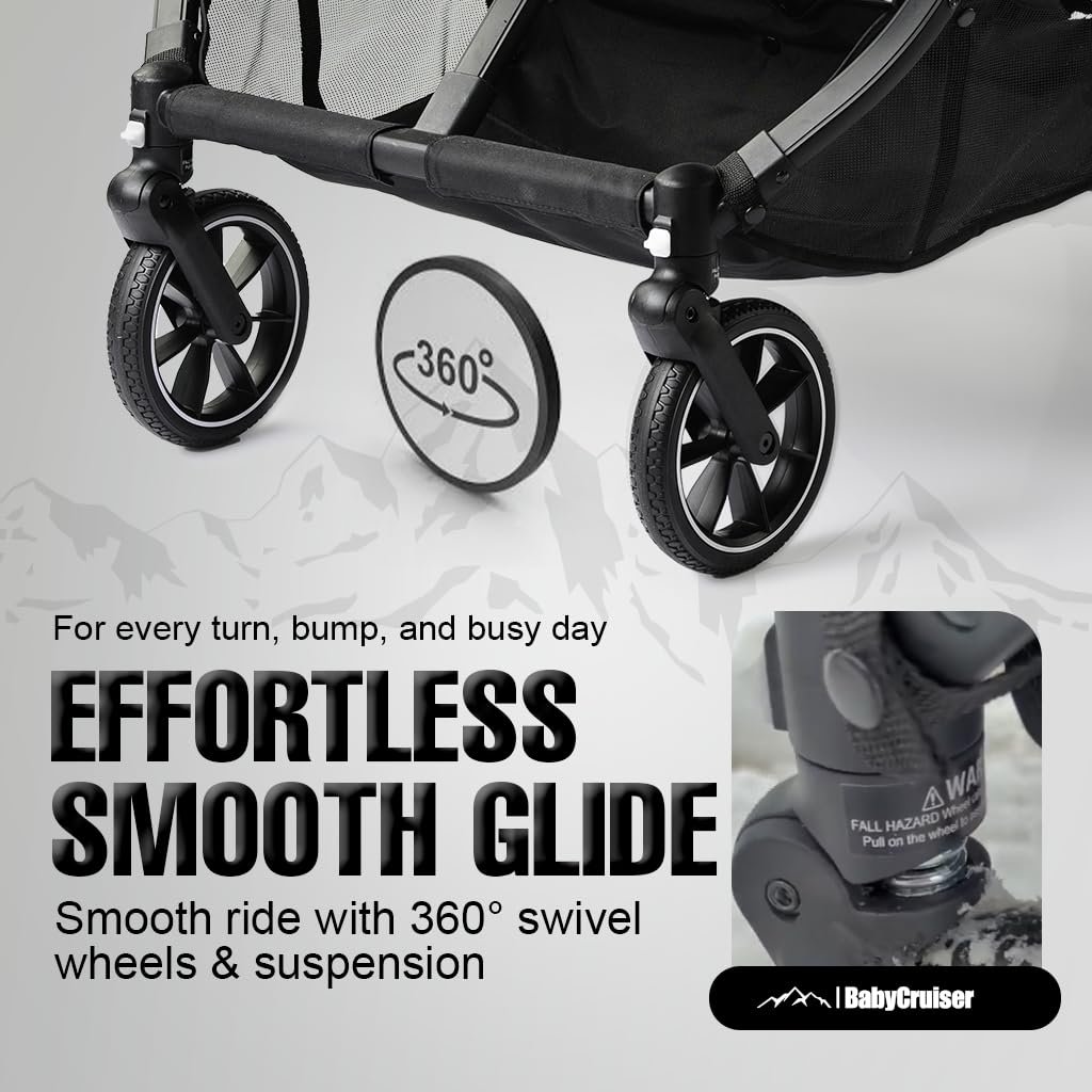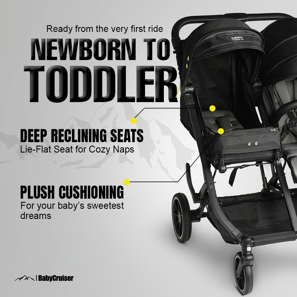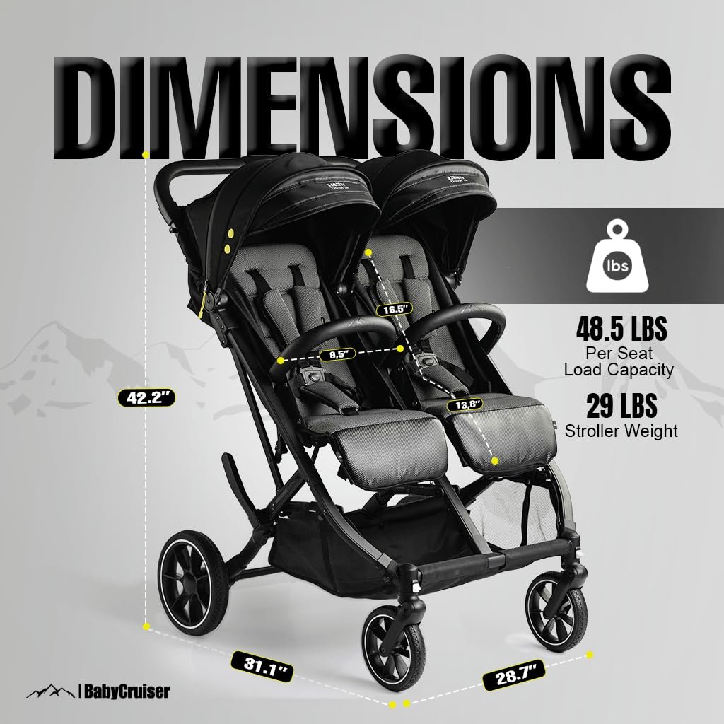 BabyCruiser Double Stroller Newborn and Toddler, Swivel Wheels, One Hand Folding, Compact Size, Lightweight Twin Stroller from Birth up to 48.5 lbs per seat