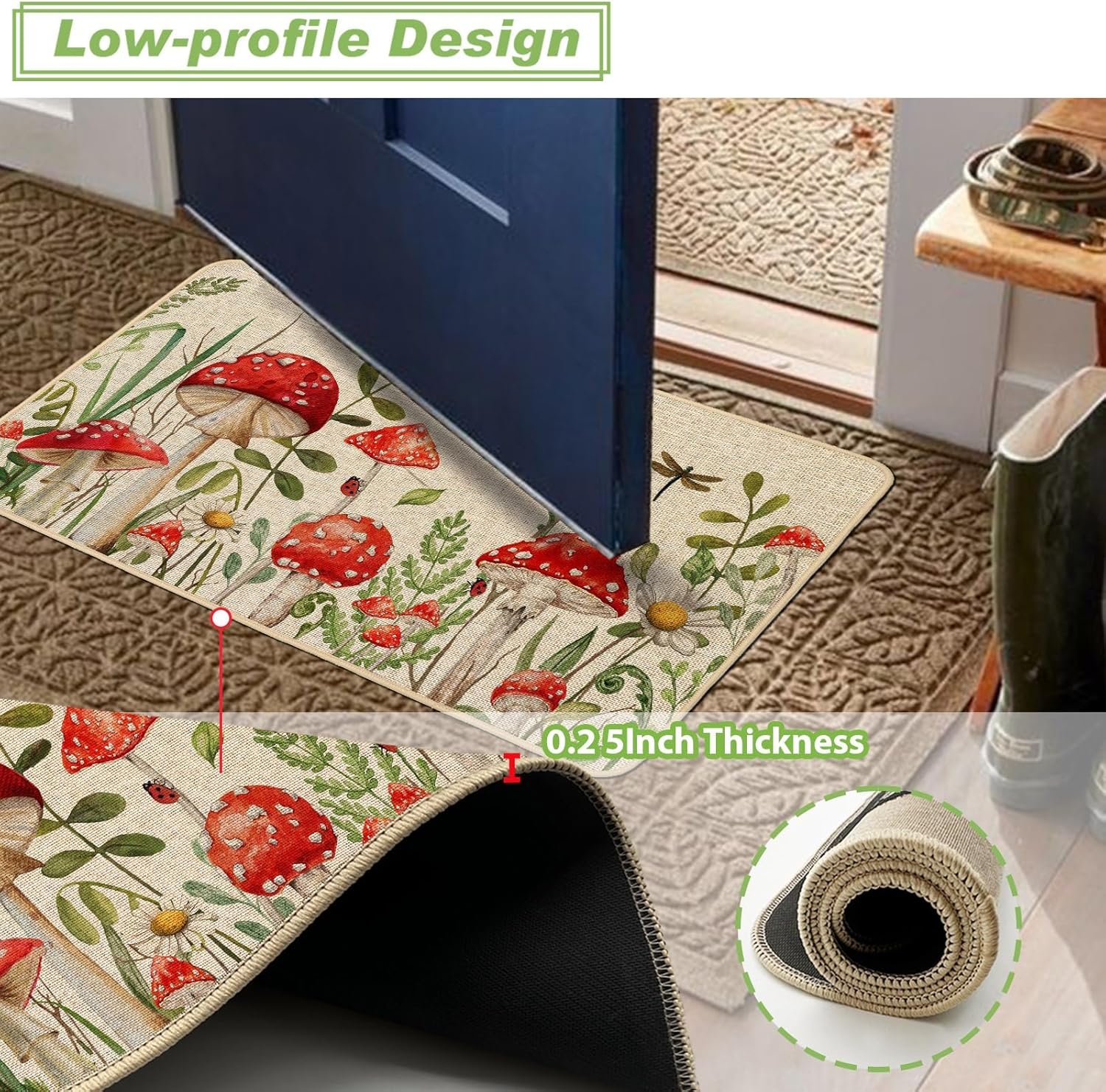 Proper Size: Our kitchen mats include 2 piece, measuring 17″ x 29″ and 17″ x 47″, with a slim 0.25″ thickness. The low-profile design ensures they do not get caught under doors. The top is made of burlap, while the underside features a durable rubber backing for fixed