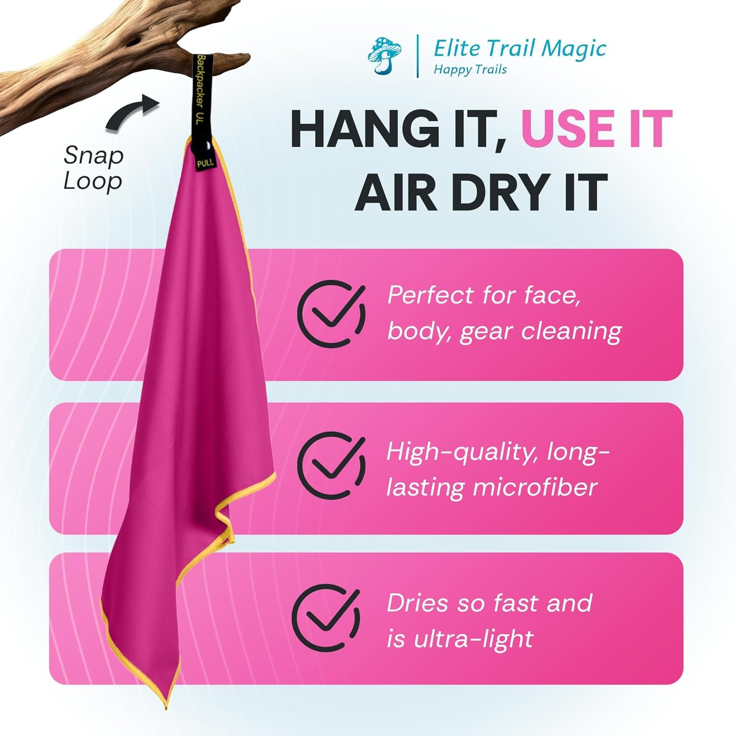 Convenient: Designed with the backpacking and hiking community in mind, this towel provides a fast, efficient and convenient solution for keeping yourself clean and dry. Say goodbye to heavy, full-size towels and embrace the convenience of the Best Quick Dry Towels for Travel. No unneccesary extra packing that you will just throw out anyways. Just hang from your pack to air dry.