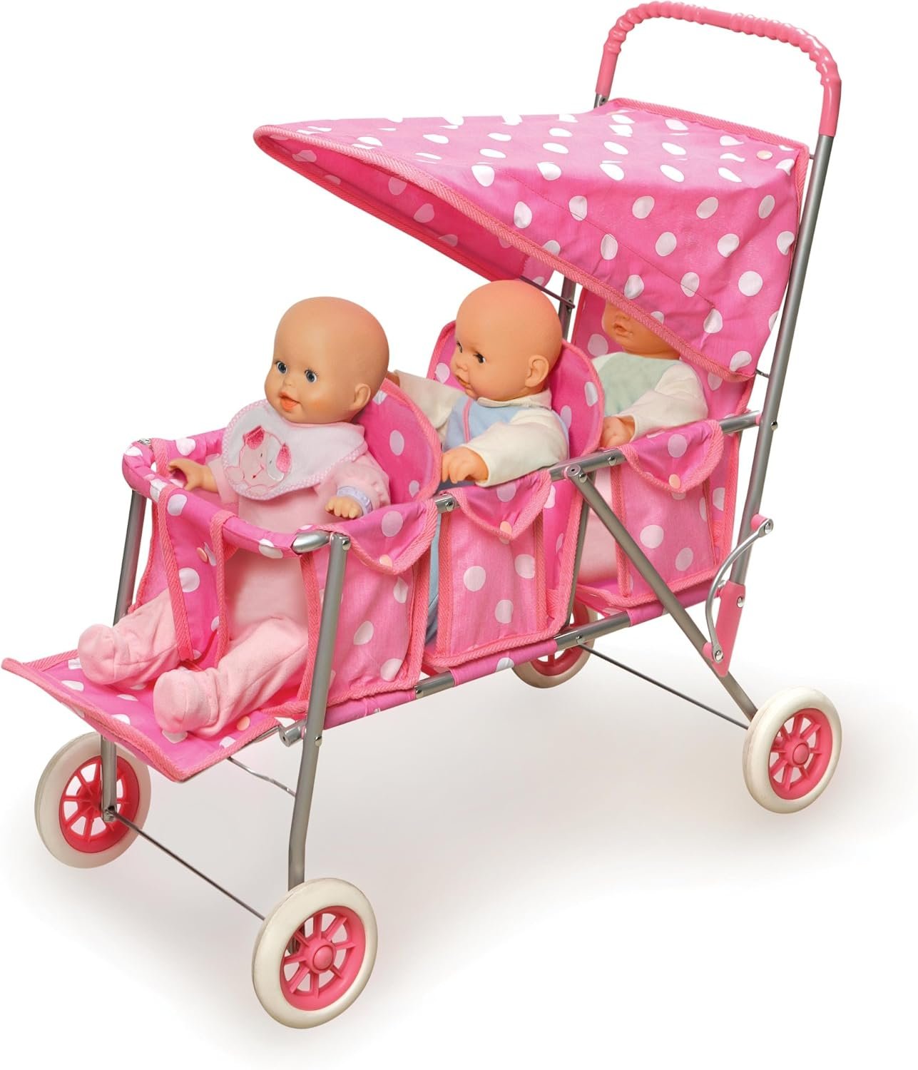 Badger Basket Triple Doll Stroller for Dolls – Lightweight and Foldable Toy Pram with Canopy – Fun Pretend Play for Kids in Stylish Pink with Polka Dots