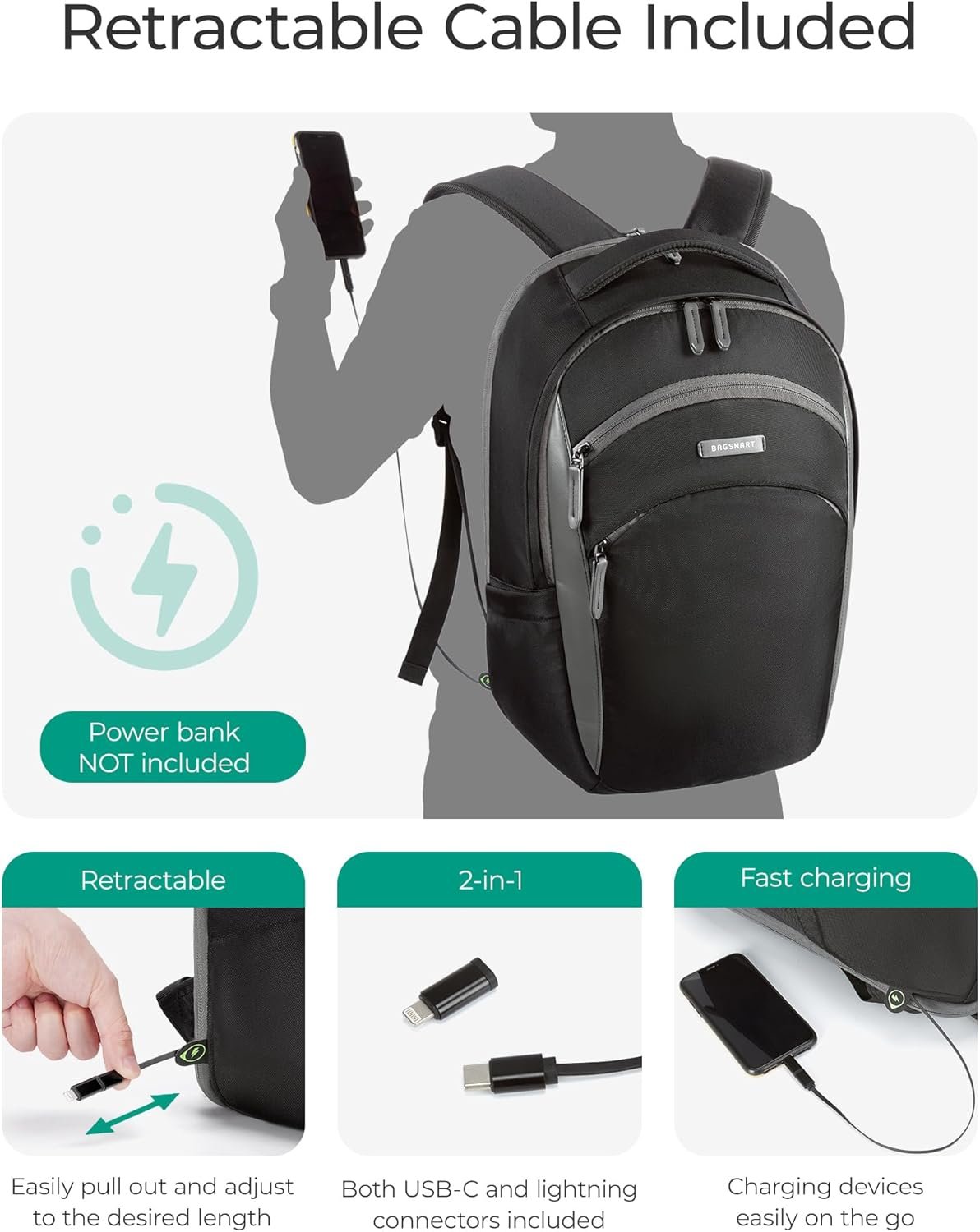 Retractable Cable: With built in USB charger outside and built in charging cable inside. Easily pull out and adjust to the desired length, which offers you a more convenient way to charge your phone while walking(power bank not included)