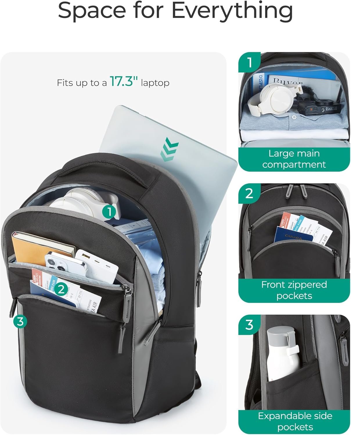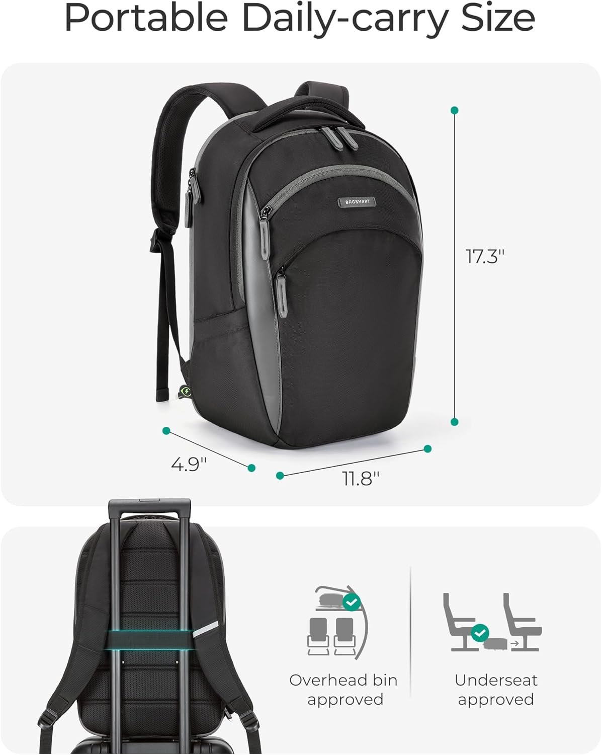 Spacious Pocket: BAGSMART laptop backpack is a master of organization, featuring multiple compartments and pockets to keep all your essentials neatly arranged. The dedicated laptop compartment can accommodate laptops up to 17 inches. Dimensions:17.3×4.9×11.8 inches