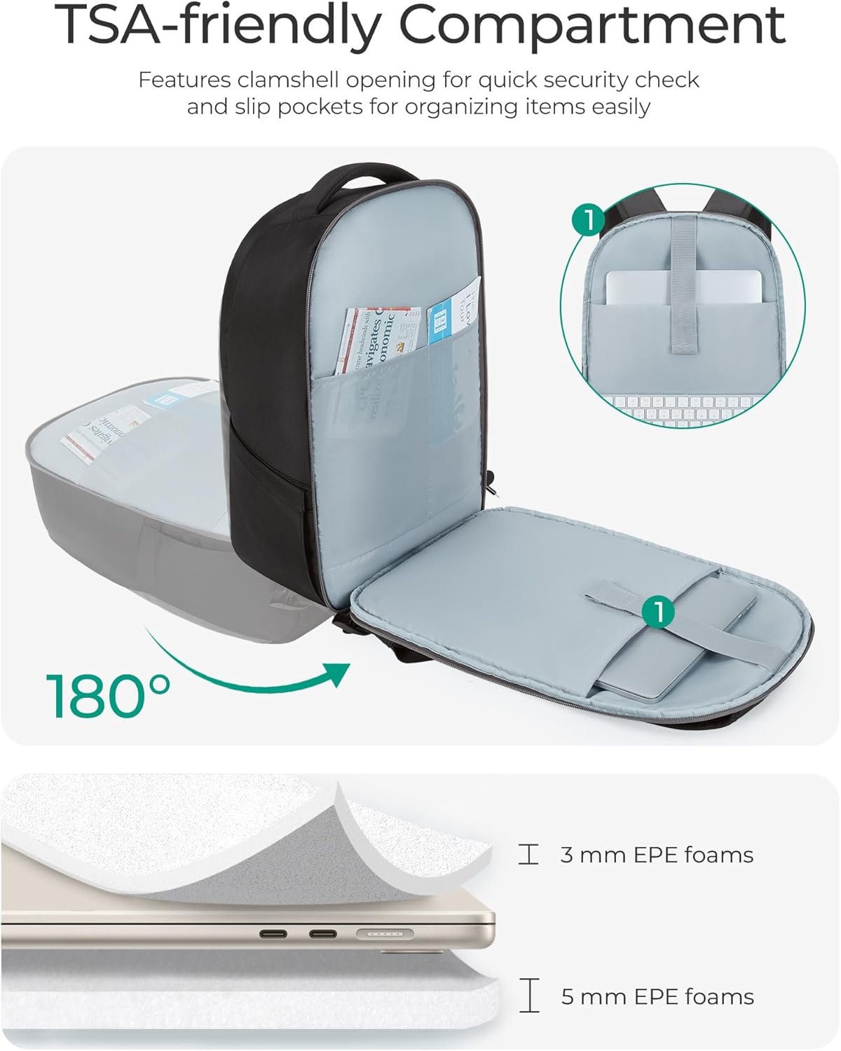 TSA-Approved Backpack: Unfold this backpack 180 degrees to breeze through airport security checks effortlessly. It smoothly slides onto your suitcase handle, staying securely in place, making airport travel truly hassle-free