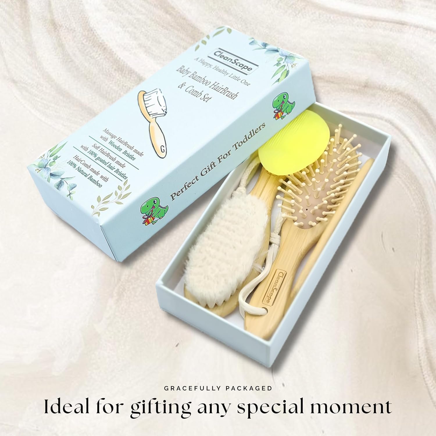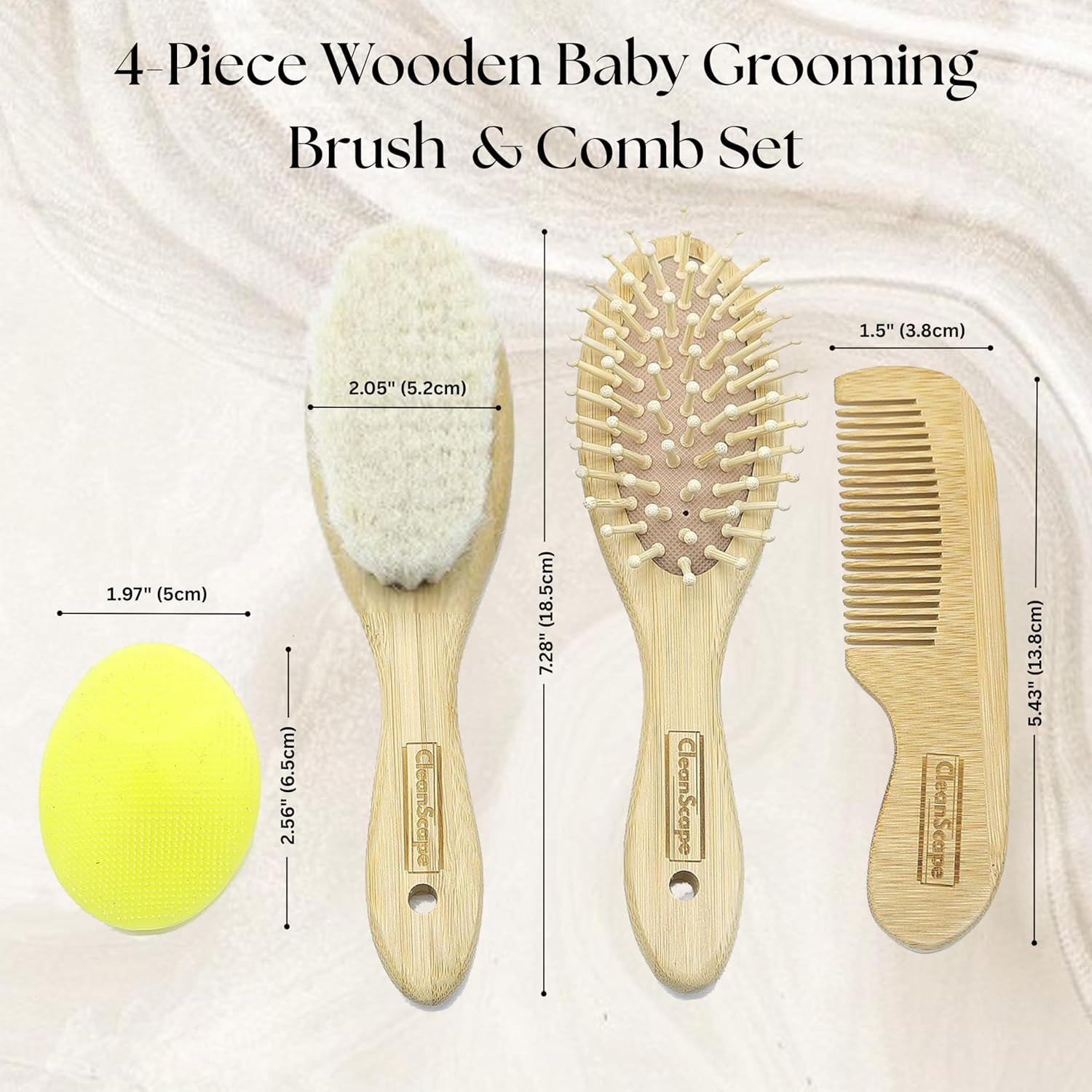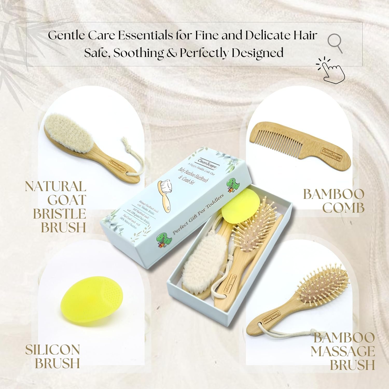 Product Description: Simplify baby care with style and sustainability using our Bamboo Baby Brush and Comb Set—an essential grooming kit designed for newborns and cherished by parents. Expertly crafted from eco-friendly bamboo and ultra-soft goat hair, this 4-piece set offers gentle, effective care for your baby’s delicate scalp while helping prevent cradle cap. Why Parents Love It: Ultra Soft Goat Hair Brush – Perfectly suited for newborns and toddlers, this brush calms, soothes, and helps reduce cradle cap with every stroke. Natural Bamboo Comb – Smooth, rounded teeth glide through fine baby hair without pulling or discomfort. Safe & Eco-Conscious – Made with sustainably sourced bamboo and natural materials, ideal for daily use on sensitive skin. Gift-Ready Presentation – Elegantly packaged in a chic box, this set makes an ideal baby shower, registry, or welcome gift. A Newborn Essential – Enhances bonding during bath time and bedtime routines while promoting healthy hair and scalp development. What’s Included 1 x Bamboo baby hairbrush with ultra-soft goat hair bristles 1 x Bamboo baby comb for gentle detangling 1 x Bamboo massage brush for stimulating the scalp 1 x Silicone round brush for a soft, soothing scalp massage