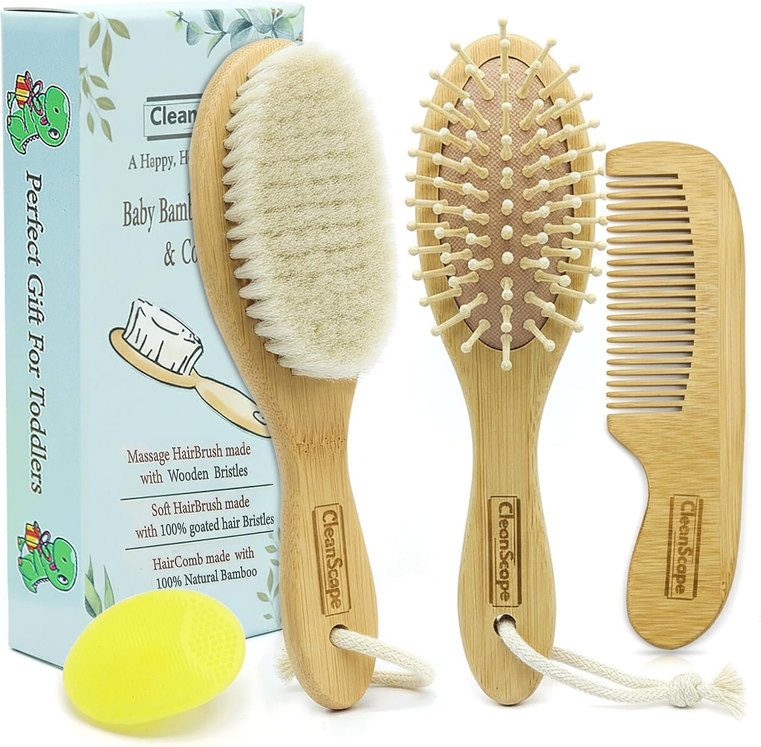 Bamboo Baby Brush & Comb Set – Newborn Grooming Kit with Soft Goat Hair Brush & Wooden Comb – Gentle Baby Care Essentials for Cradle Cap & Baby Shower Gifts