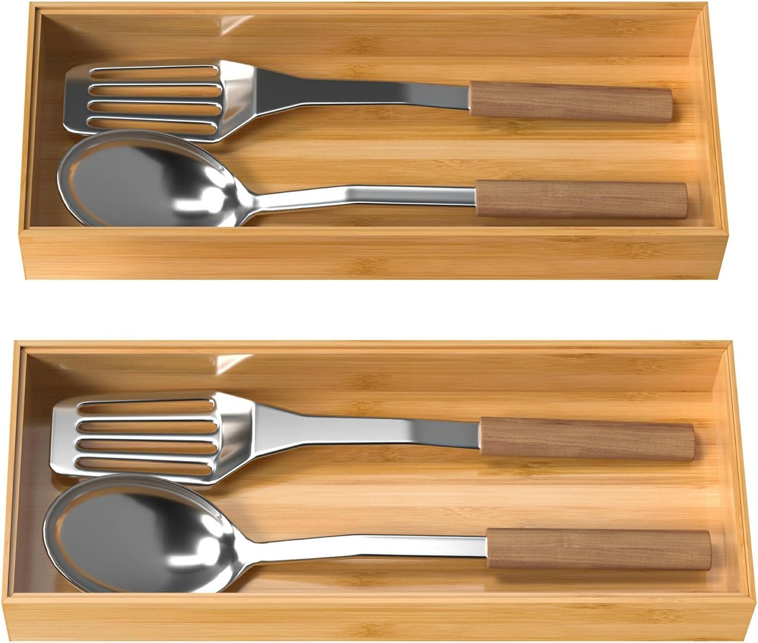 Bamboo Drawer Organizer, Stackable Utensil Organizer for Kitchen, Bamboo Storage Box Wood Silverware Tray for Drawer 15″ x 6″ x 2″ Set of 2